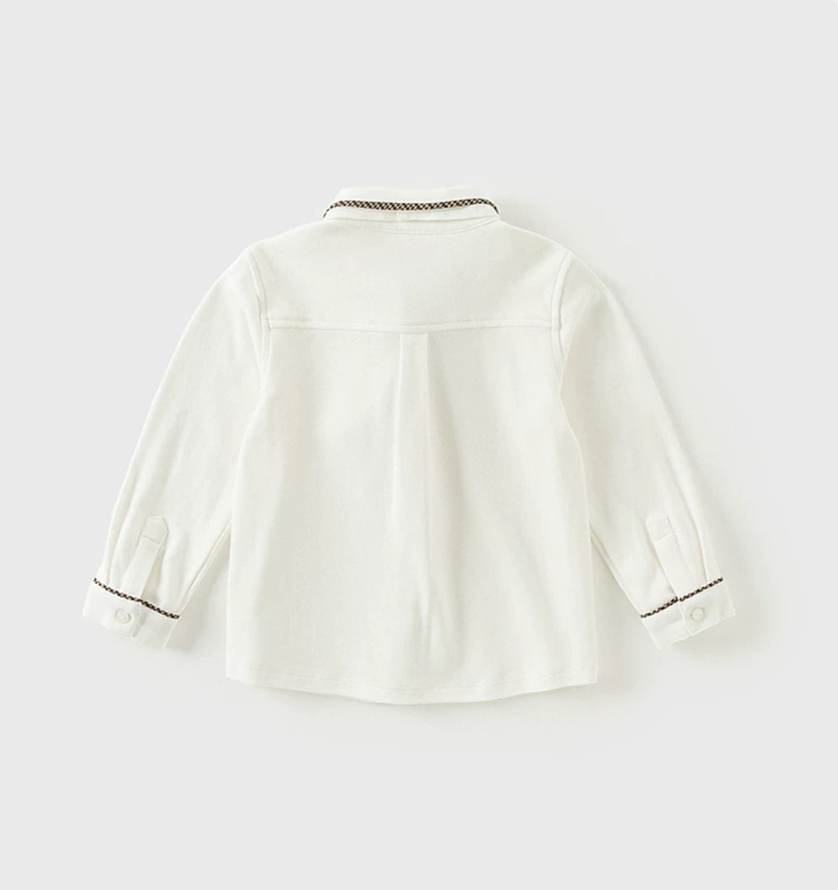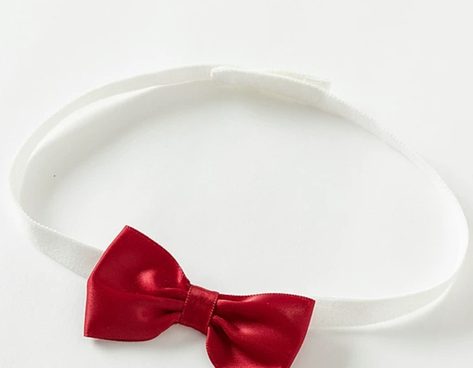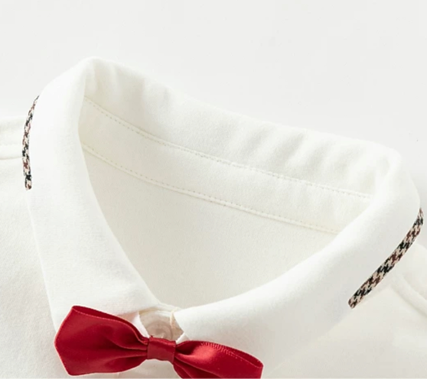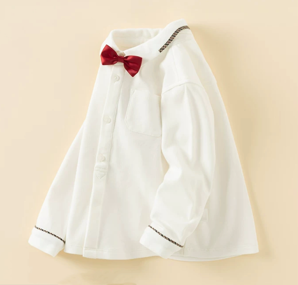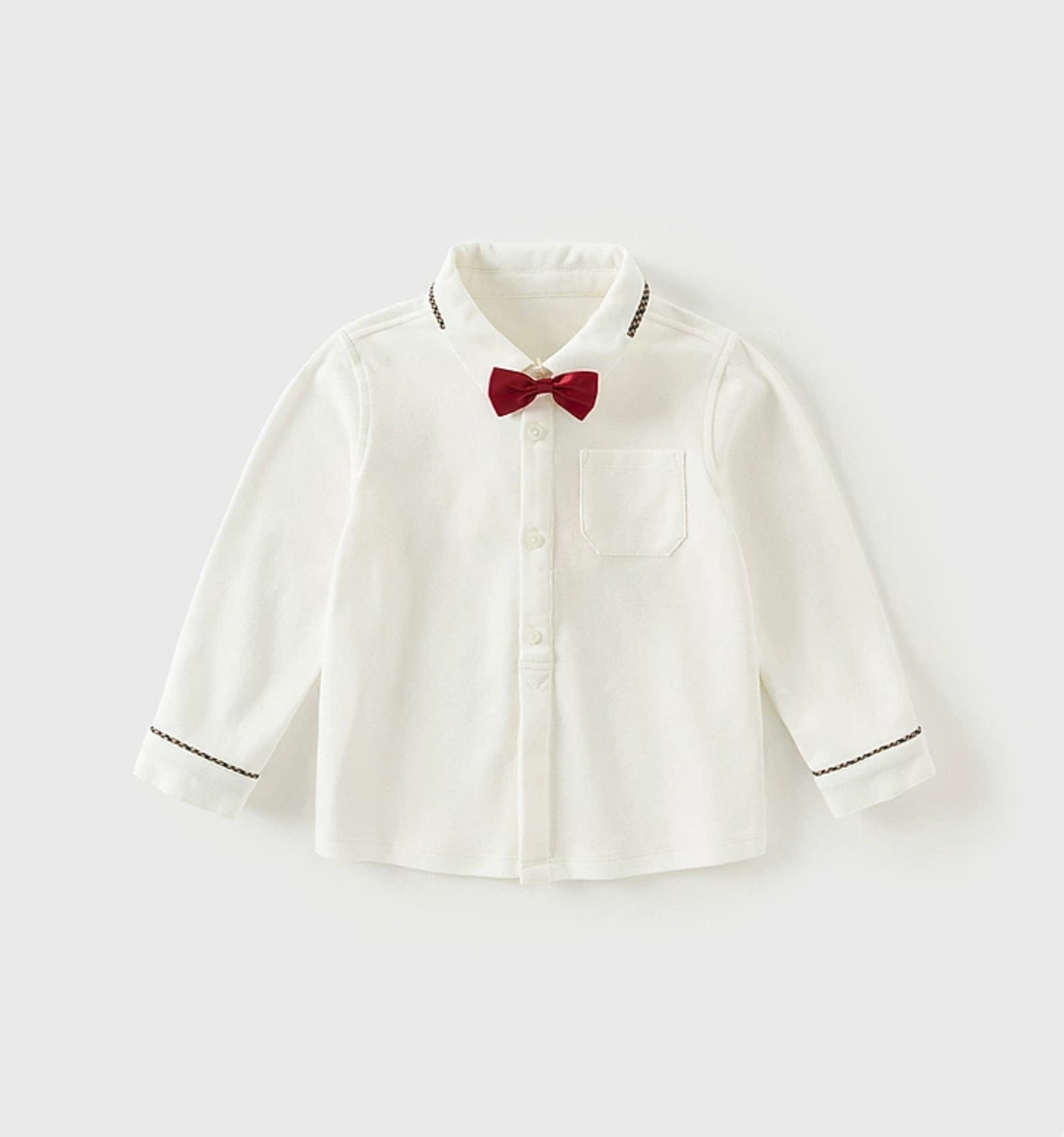 レッドカラーのボウタイ付きが目をひくシャツです。