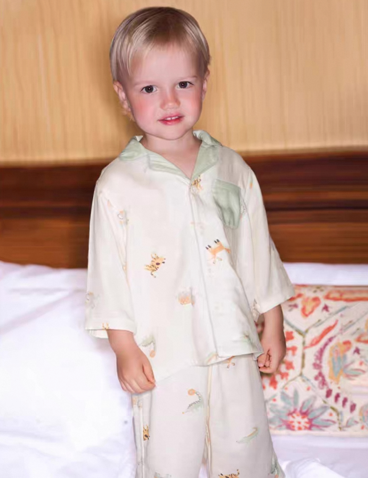 淡いアイボリーカラーに、かわいらしい動物デザインが散りばめられたパシャマです。