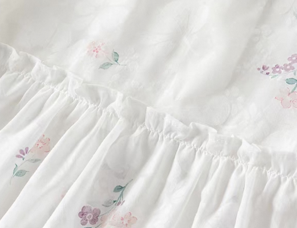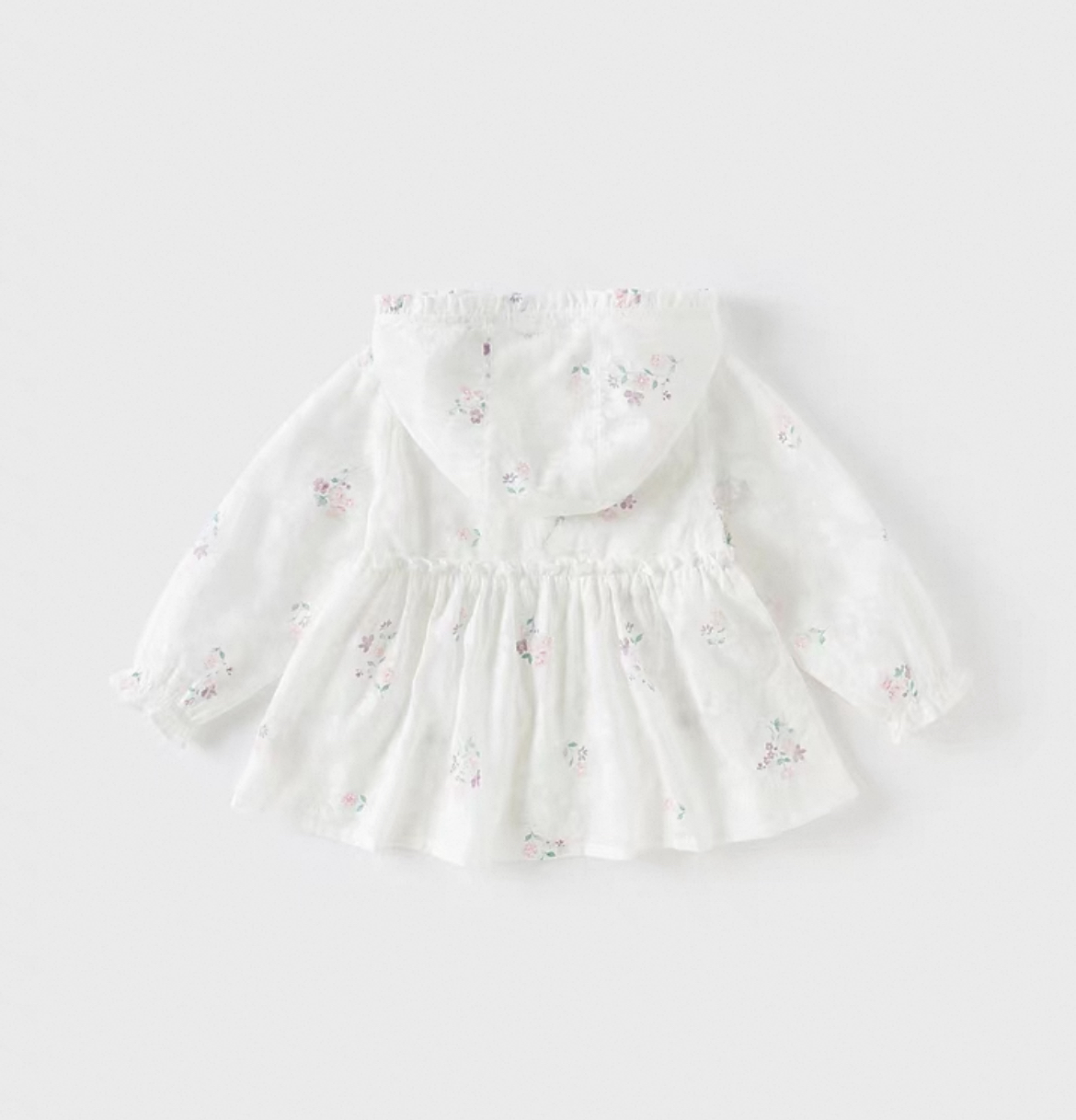 柔らかいホワイト地に小花柄が散りばめられた、春夏らしいアウターです。