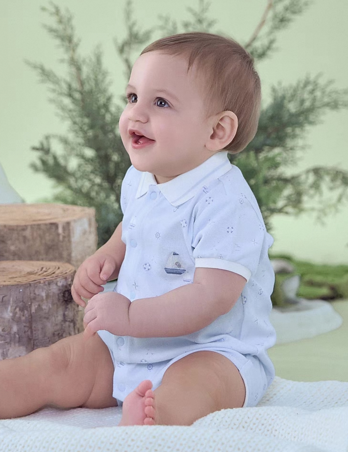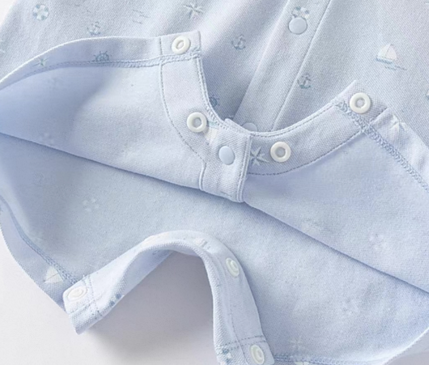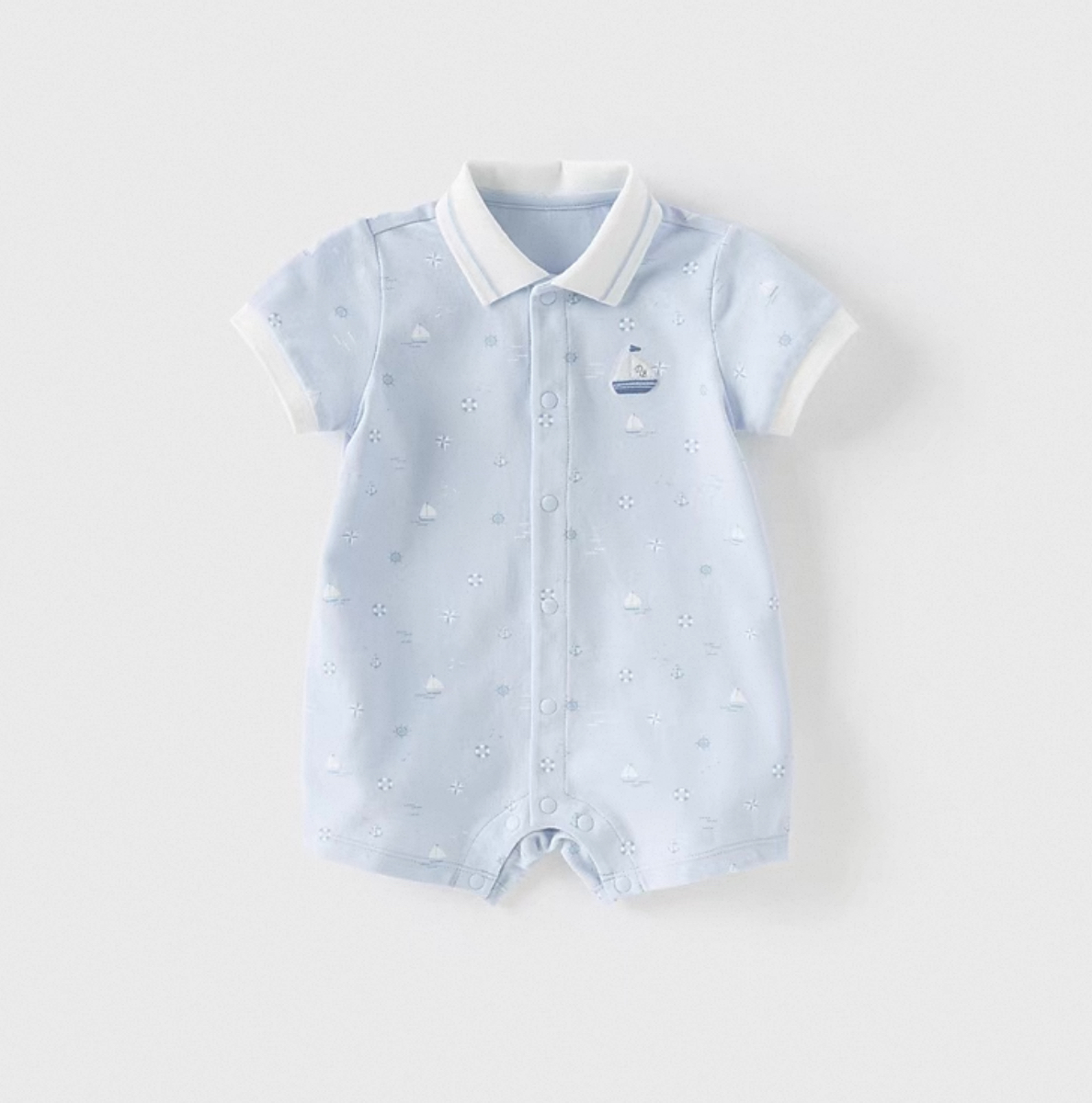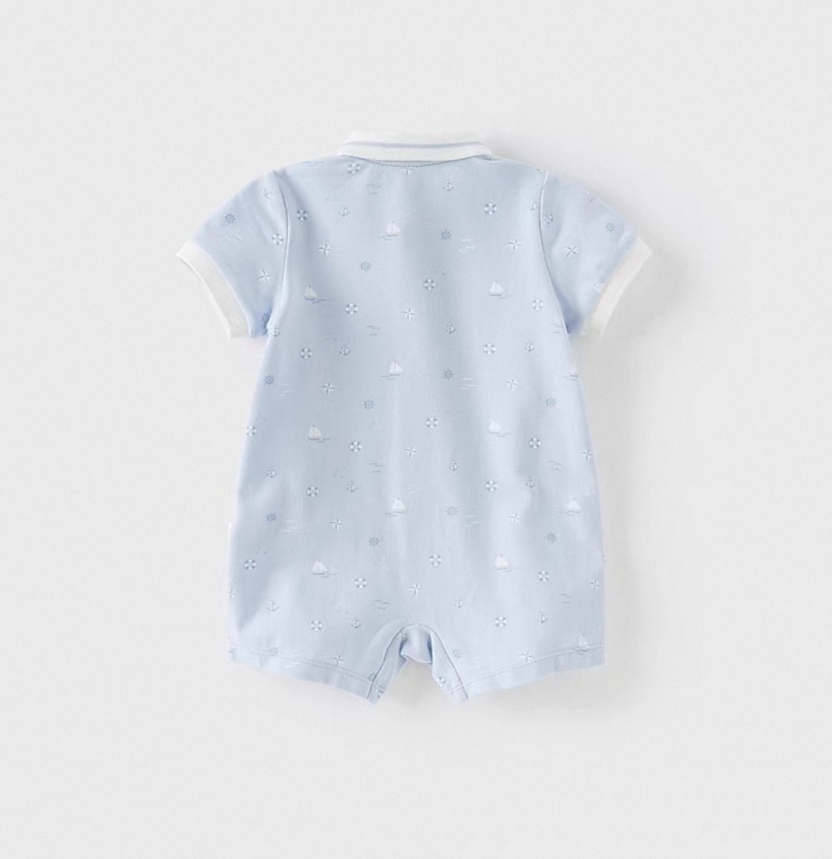 涼しげな水色ベースに、ヨットや舵、波模様などのマリンモチーフが全体に散りばめられた、夏らしいデザインのロンパースです。