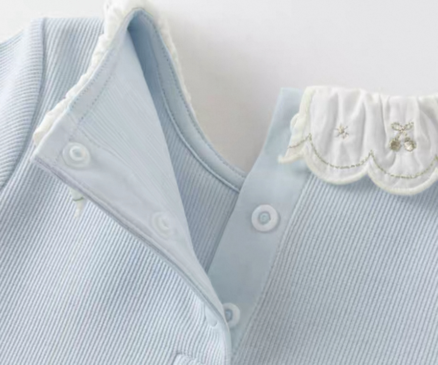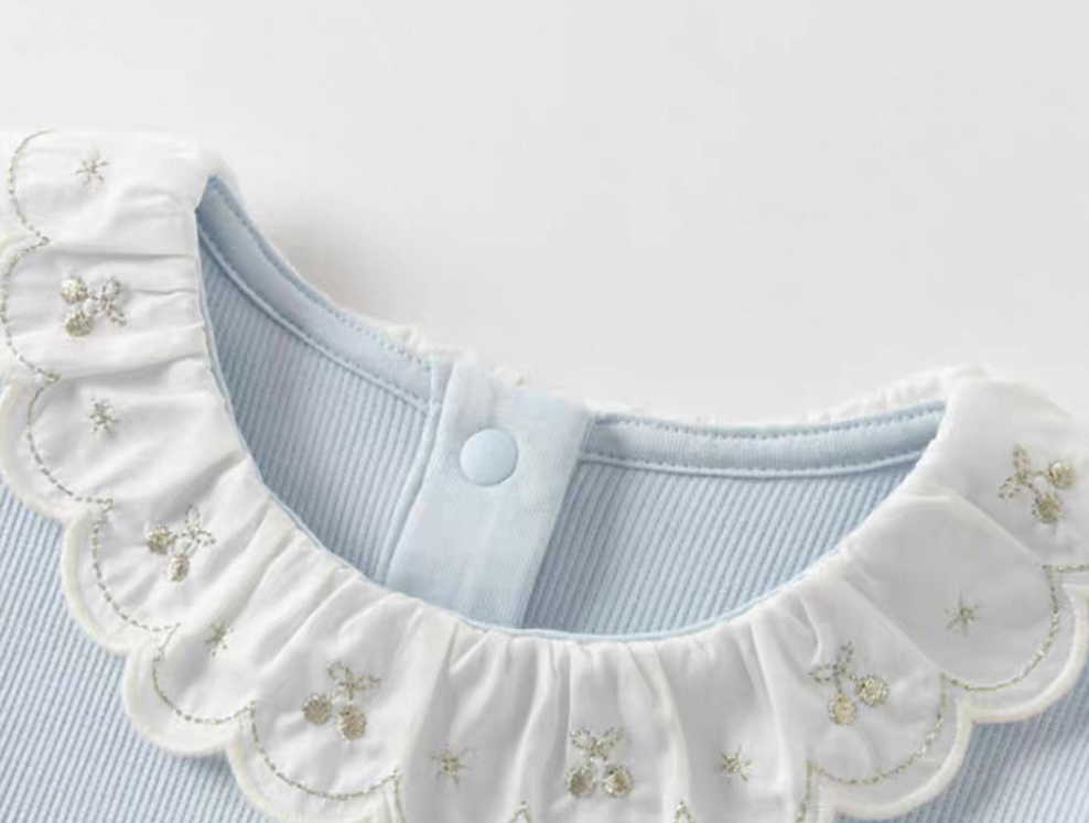 首元にはフリル仕立てのレース襟があしらわれ、華やかで可愛らしい印象になっています。