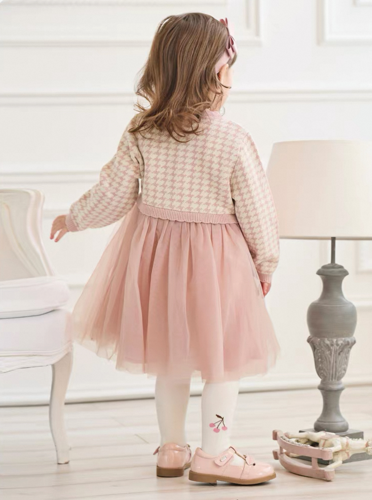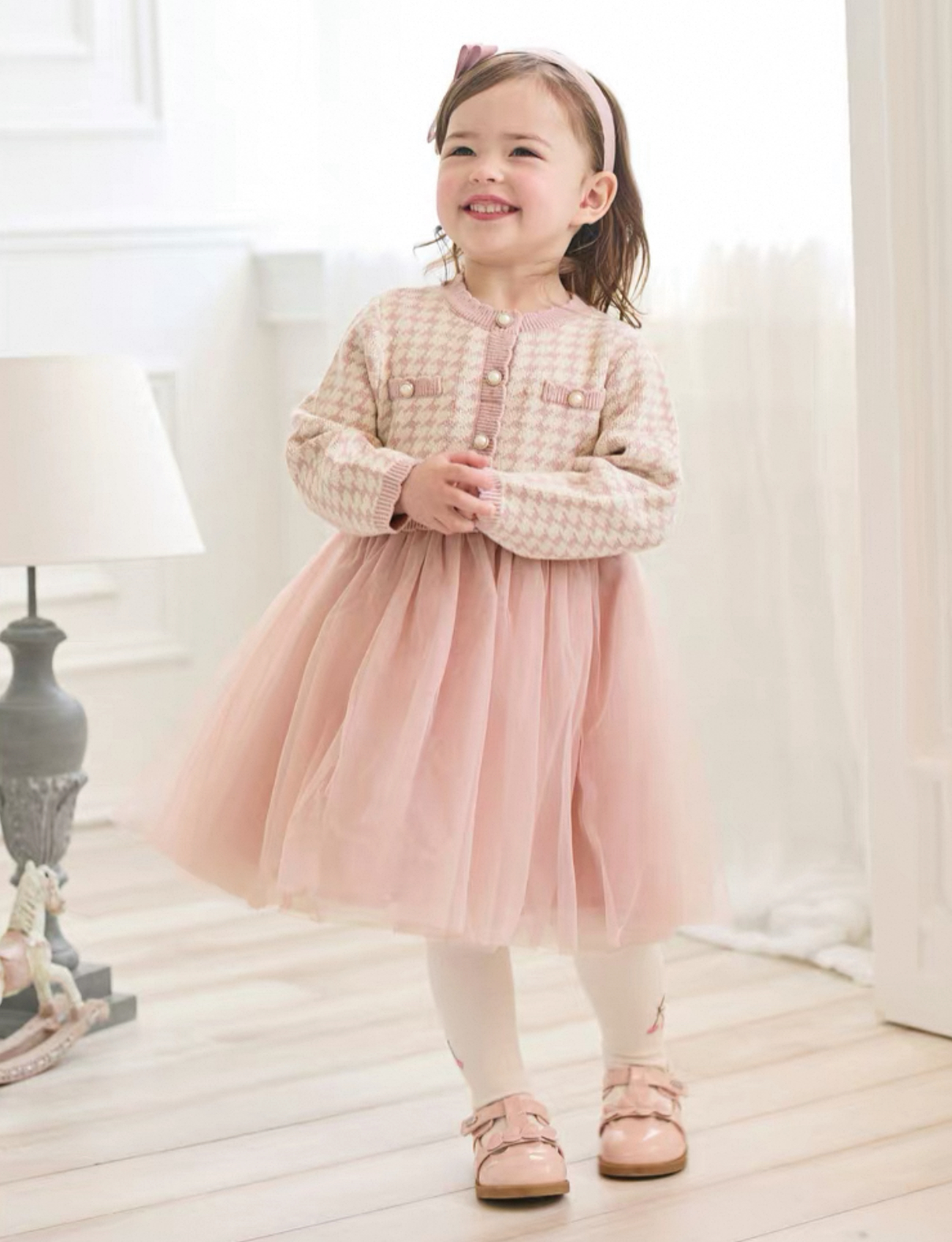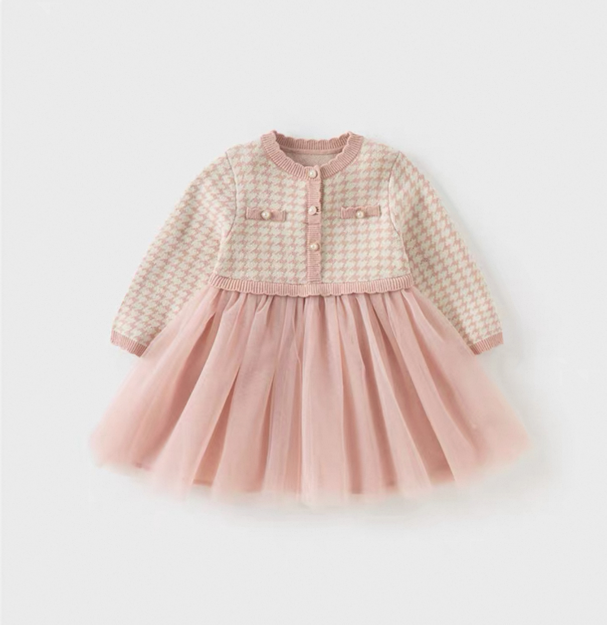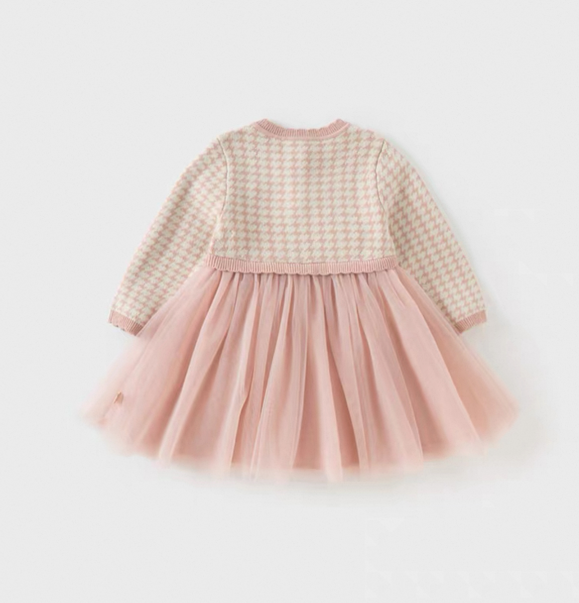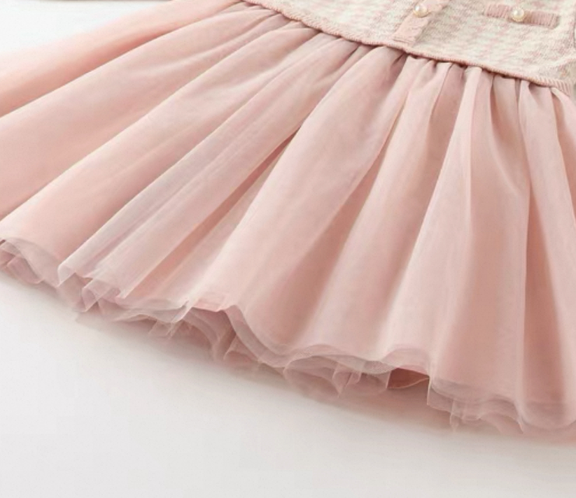 上品なピンクの千鳥格子ニットと、ふんわり広がるチュールスカートがドッキングしたドレス風ワンピースです。