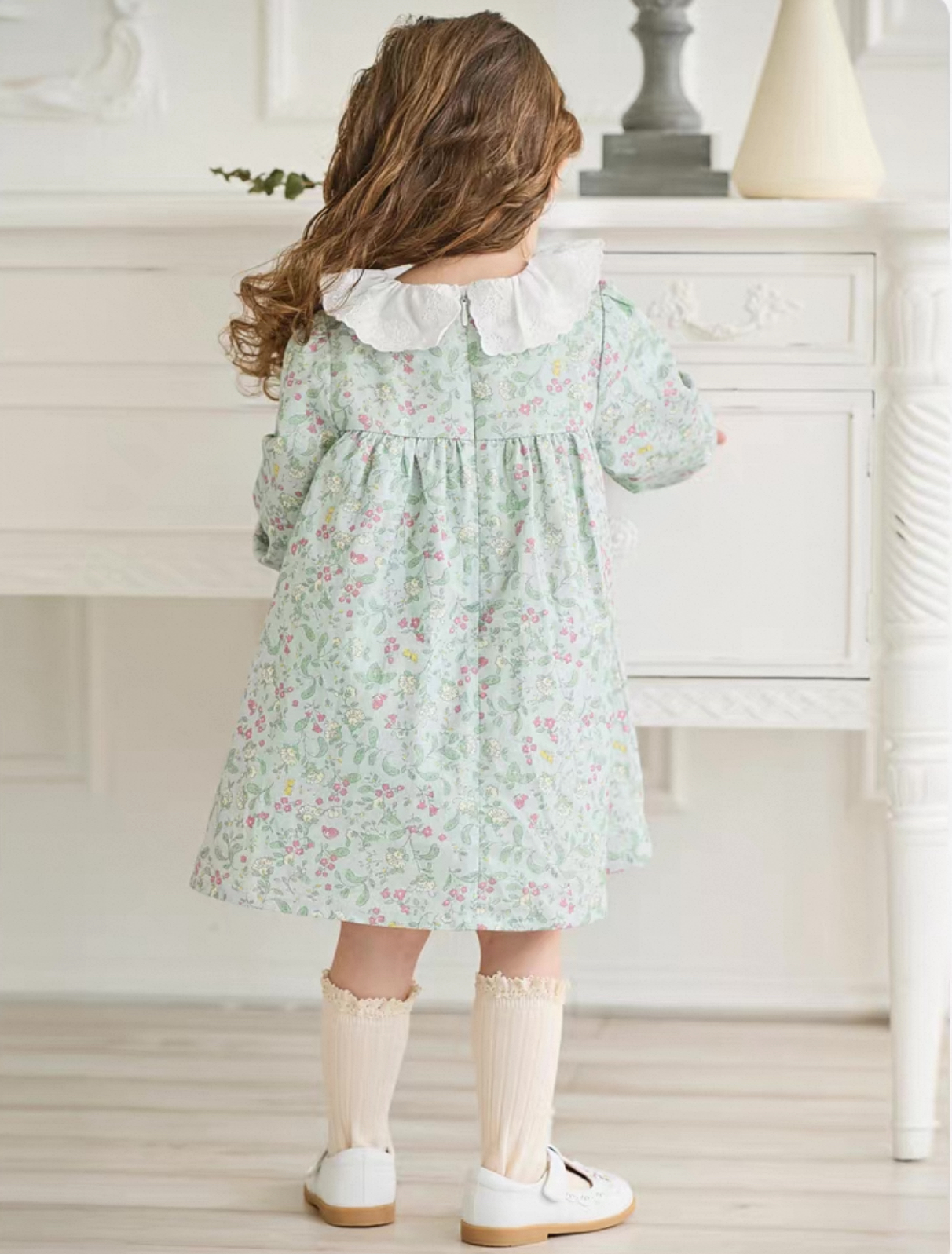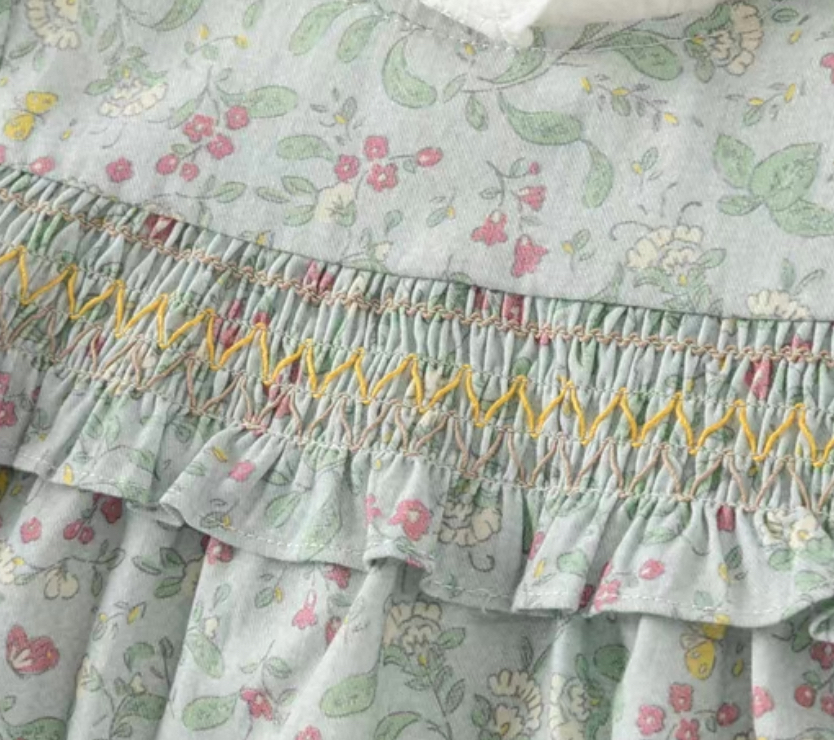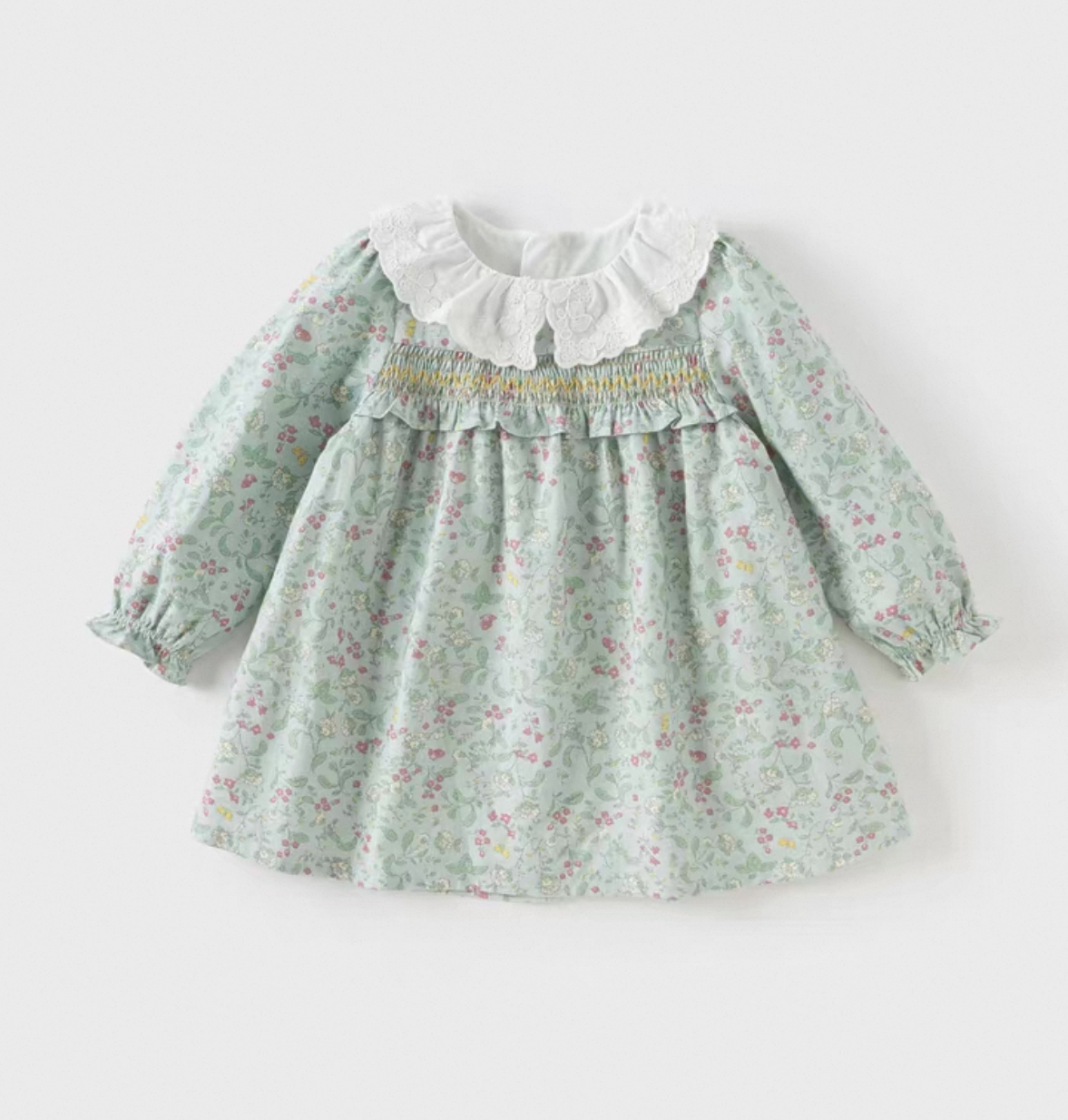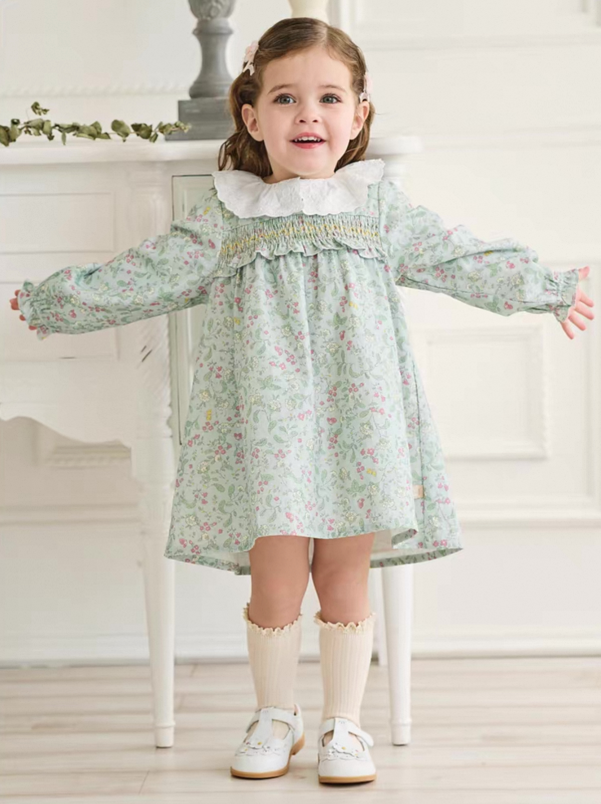 上品な小花柄と繊細なスモッキング刺繍が可愛らしさを引き立てる長袖ワンピースです。