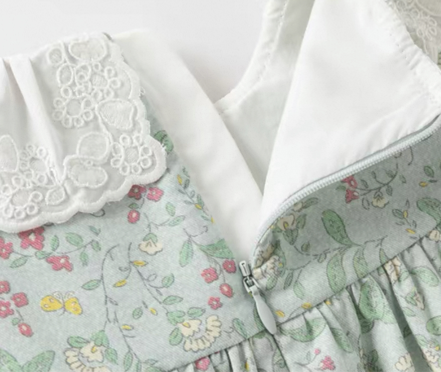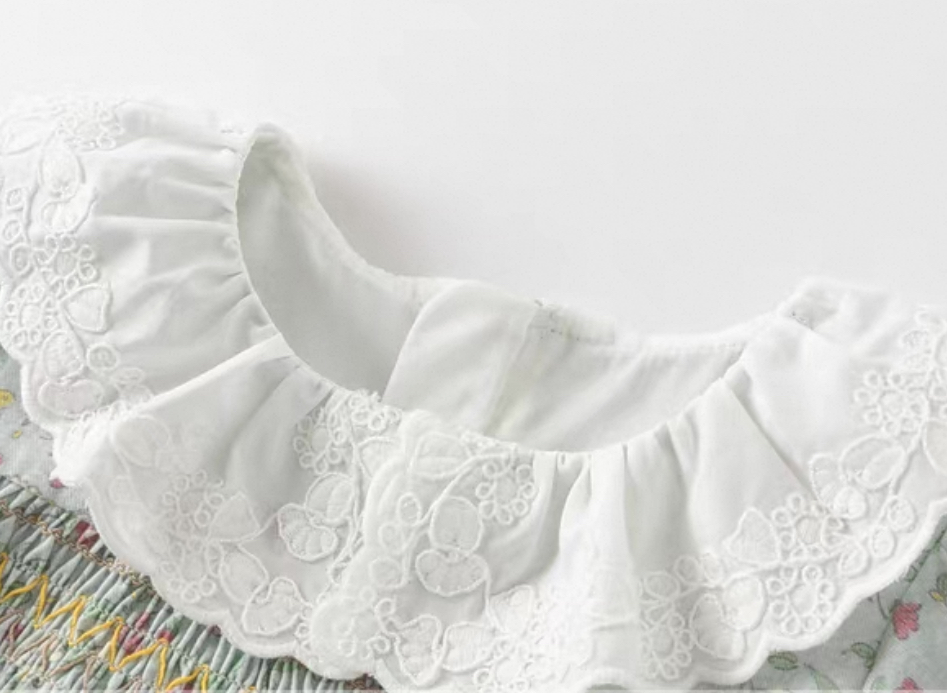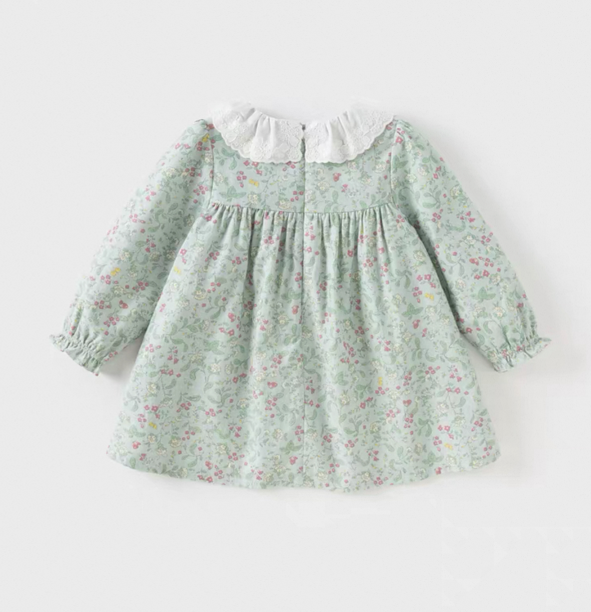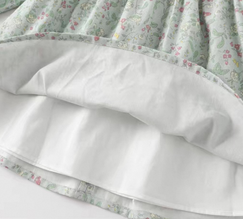 上品な小花柄と繊細なスモッキング刺繍が可愛らしさを引き立てる長袖ワンピースです。