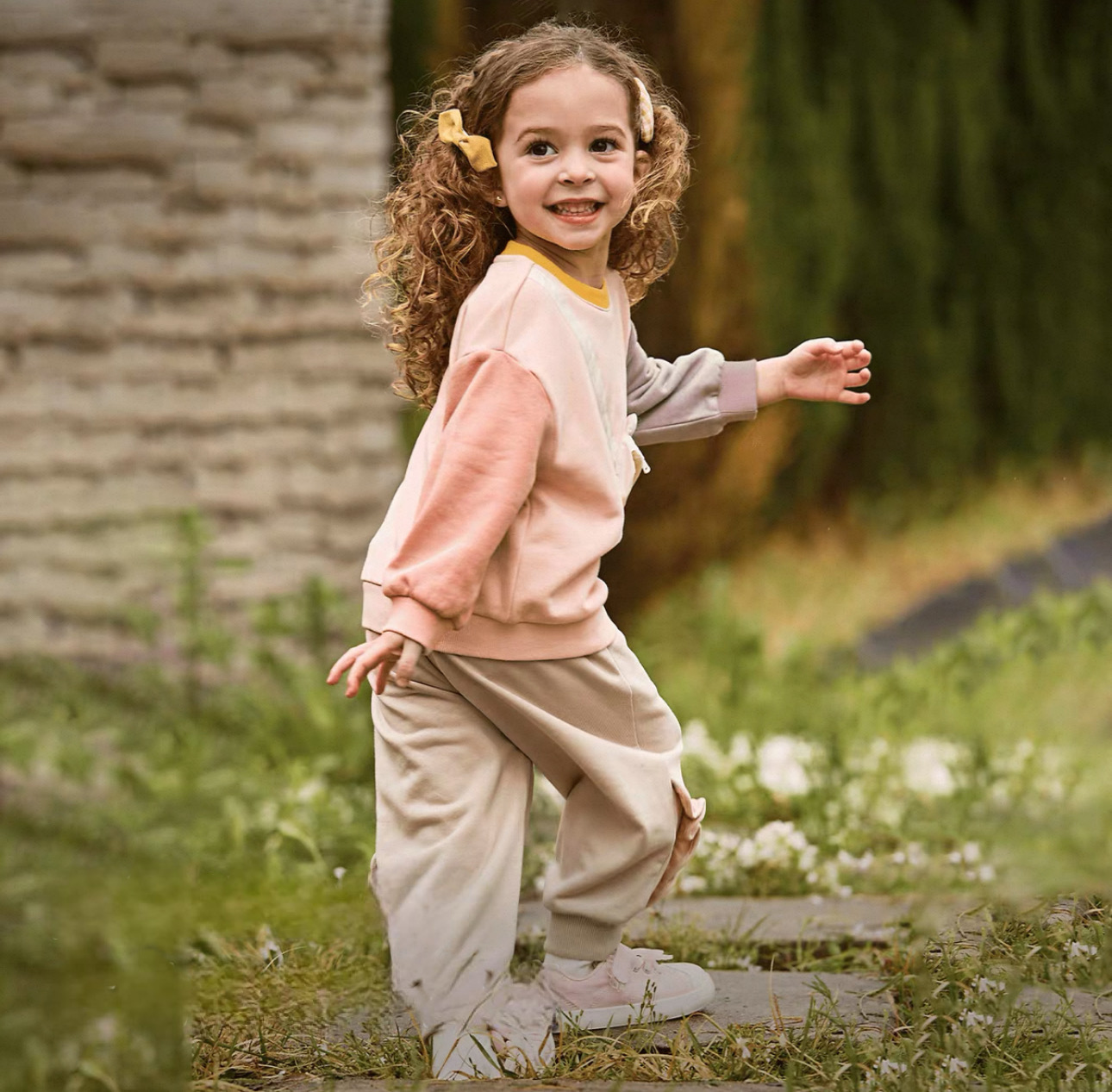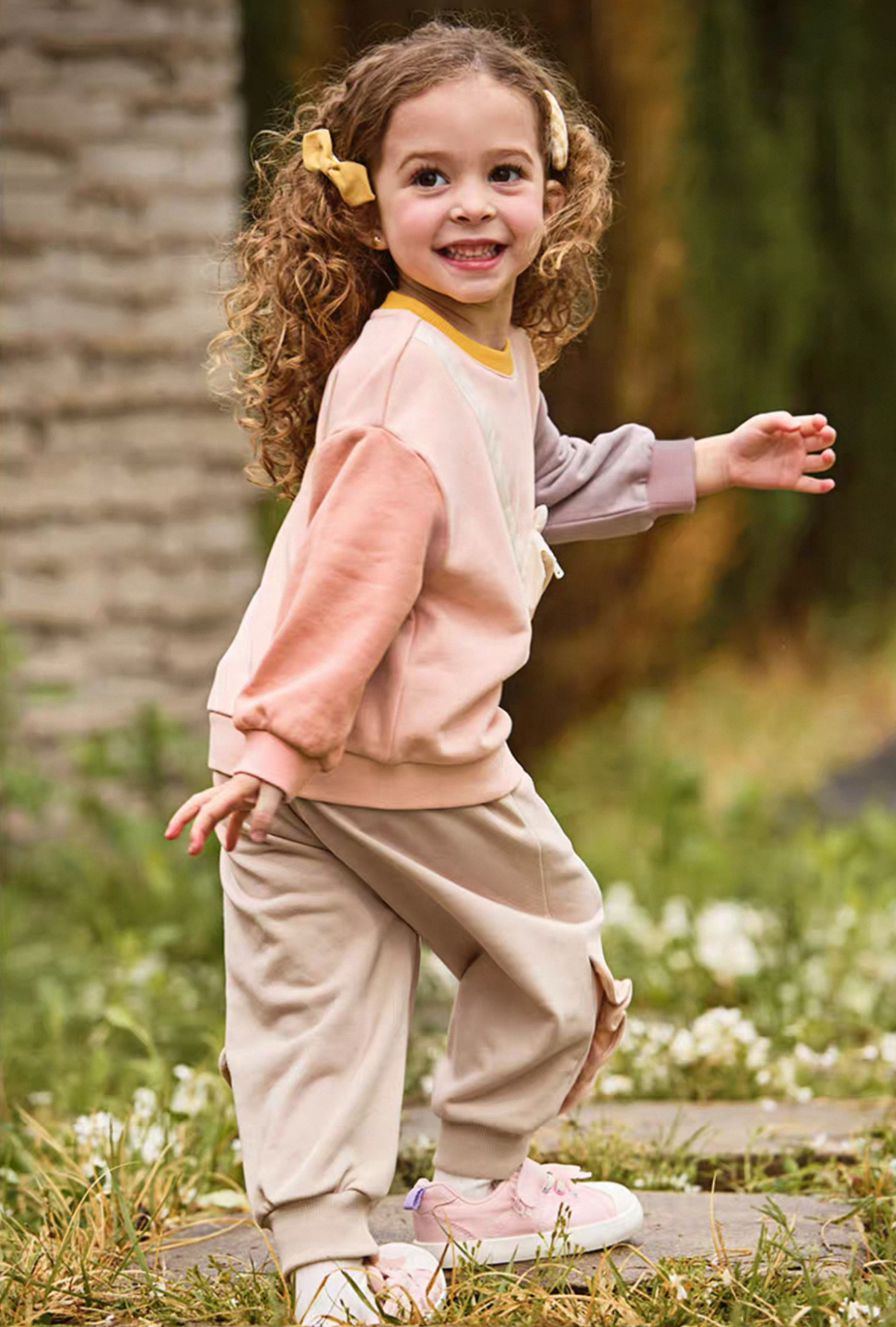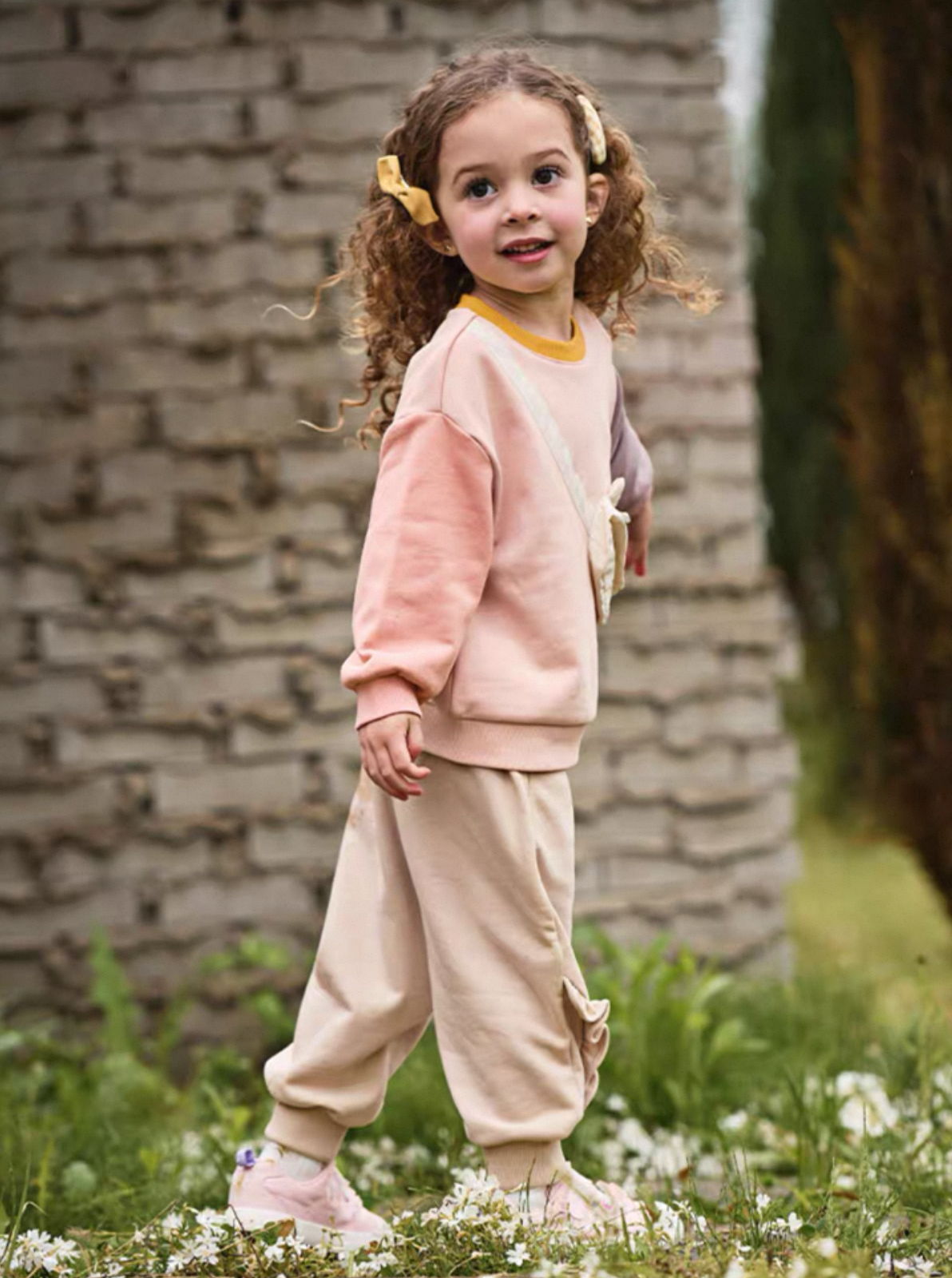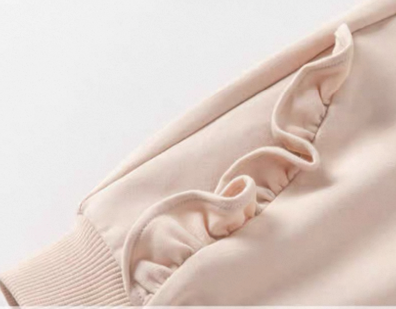 両サイドに施されたさりげないフリルデザインが女の子らしさをプラスし、シンプルながらも可愛らしい印象になっています。