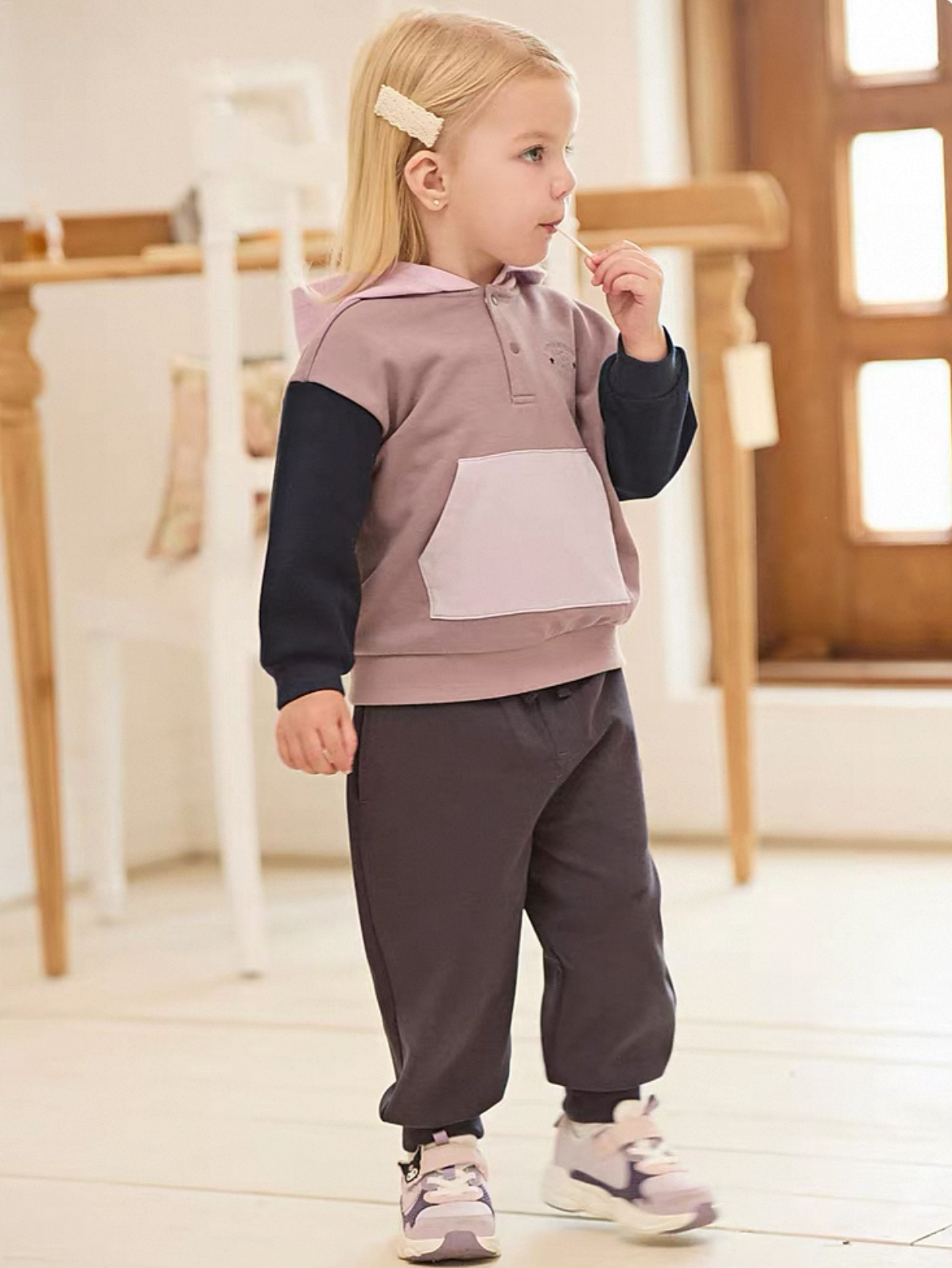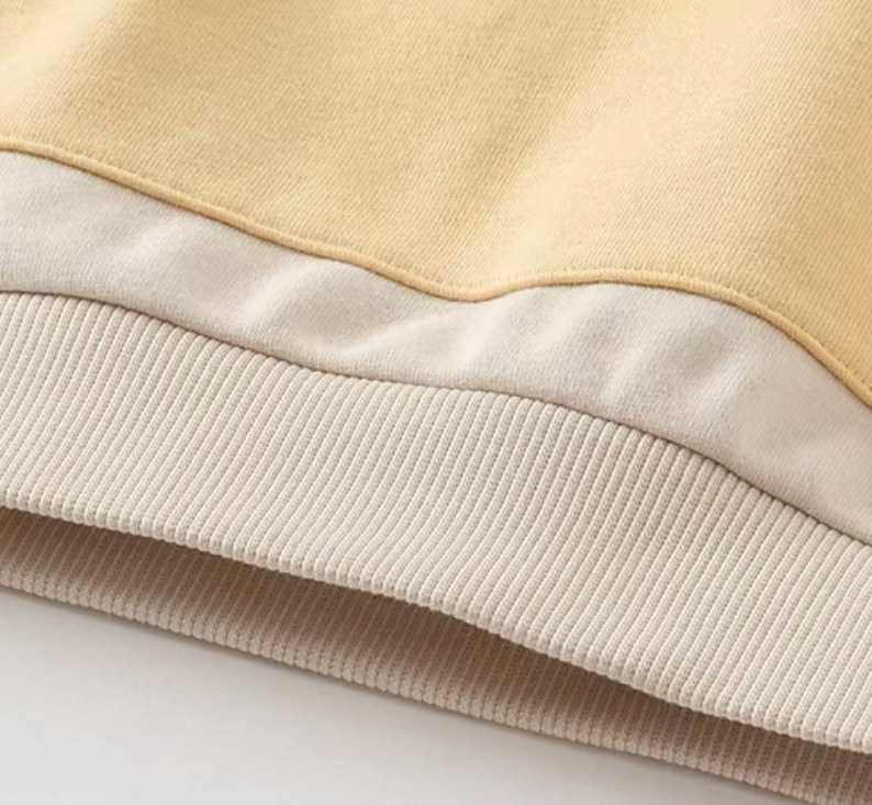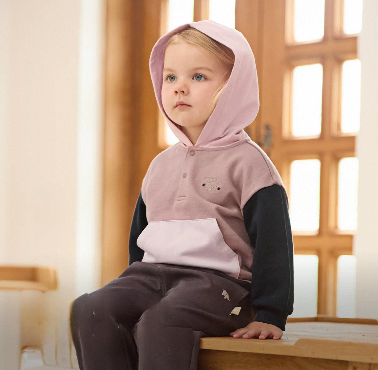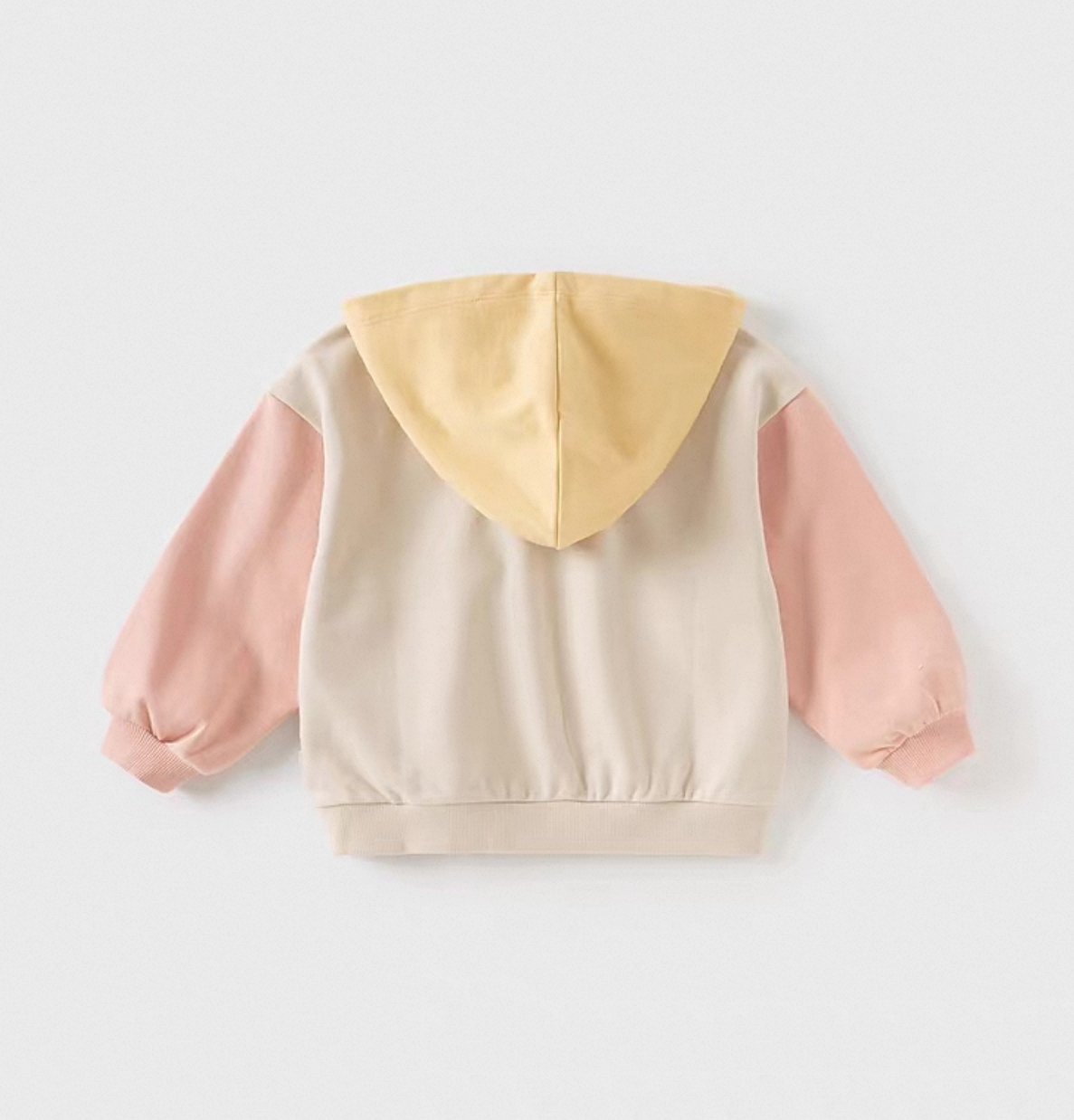 やわらかなカラーリングが可愛い、バイカラーデザインのキッズフーディです。