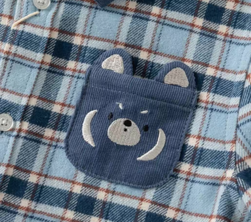 胸ポケットにはくまさんのフェイスモチーフがデザインされており、遊び心あふれるアクセントになっています。