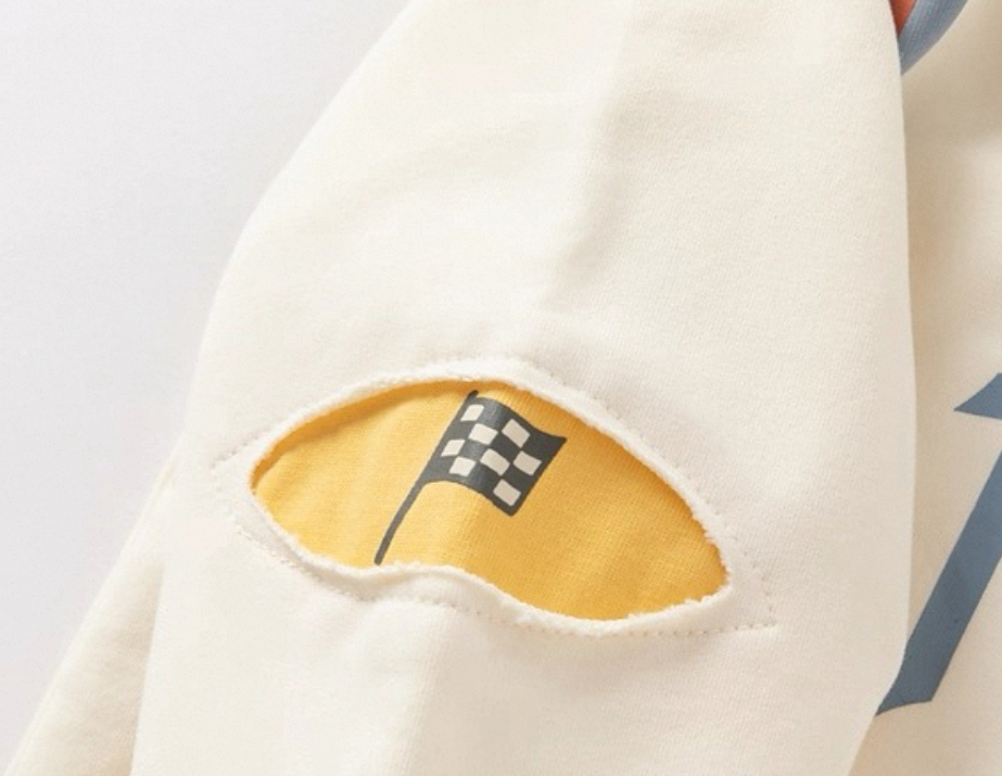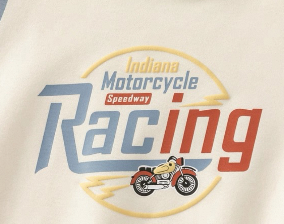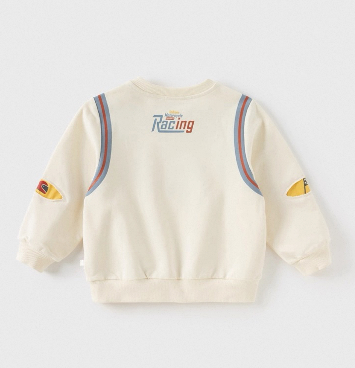 「Racing」ロゴとバイクのプリントが目を引く、元気いっぱいのトレーナーです。