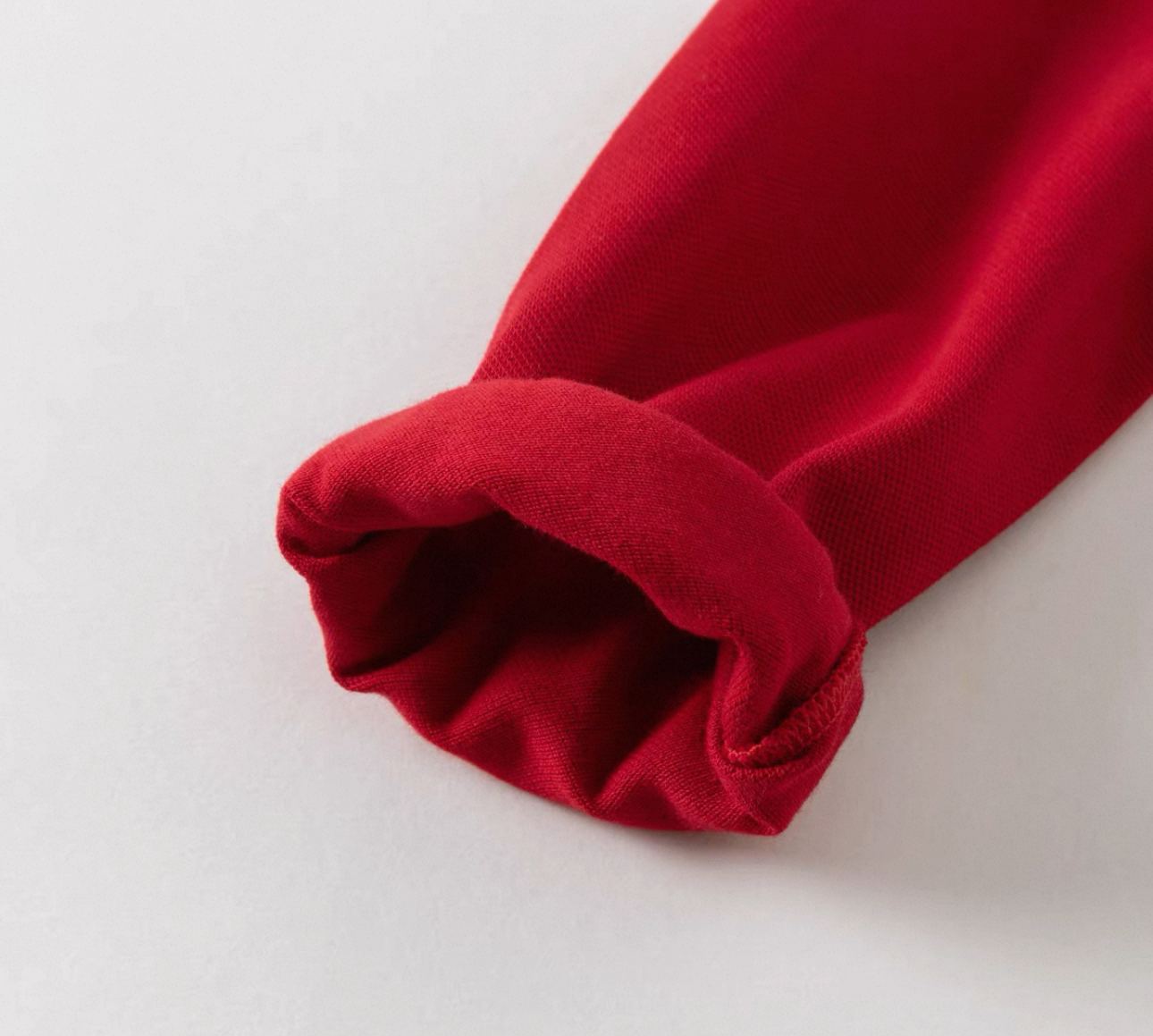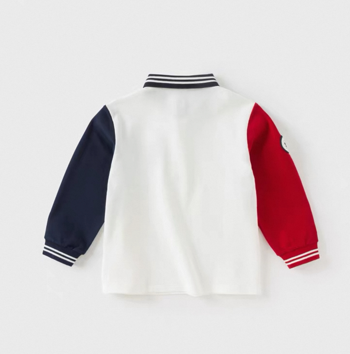 ホワイトのボディに、レッドとネイビーの袖を組み合わせたバイカラーデザインで、1枚でスタイリッシュに決まります。