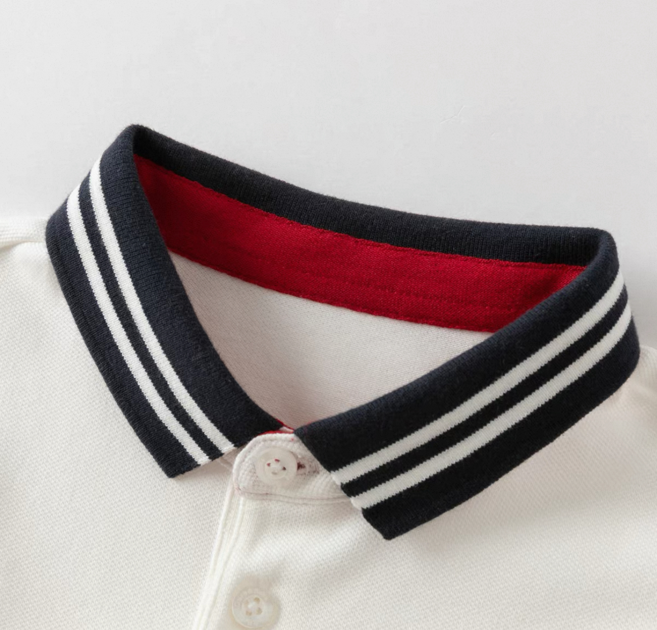 トリコロール配色が目を引く、スポーティーな雰囲気の長袖ポロシャツです。