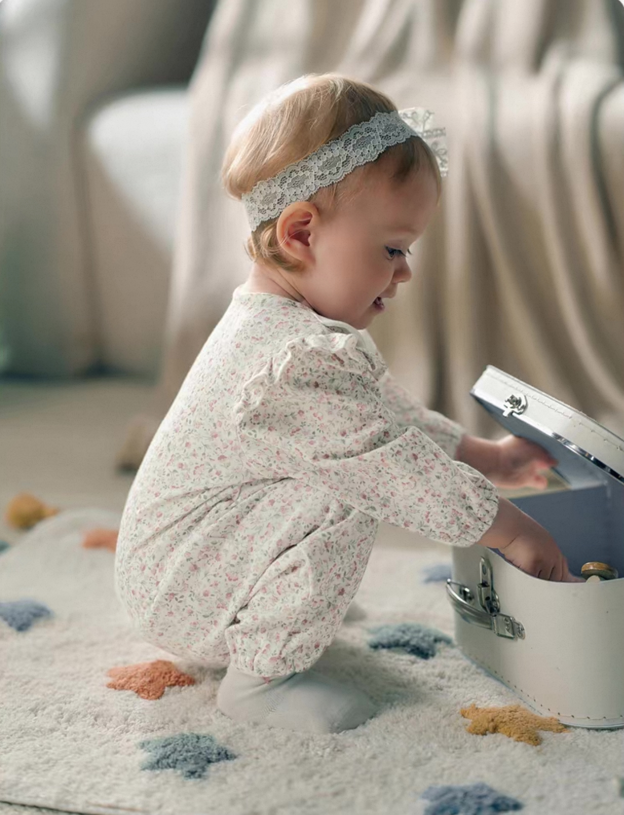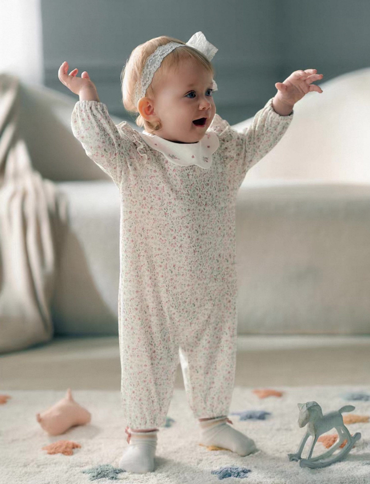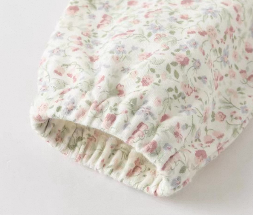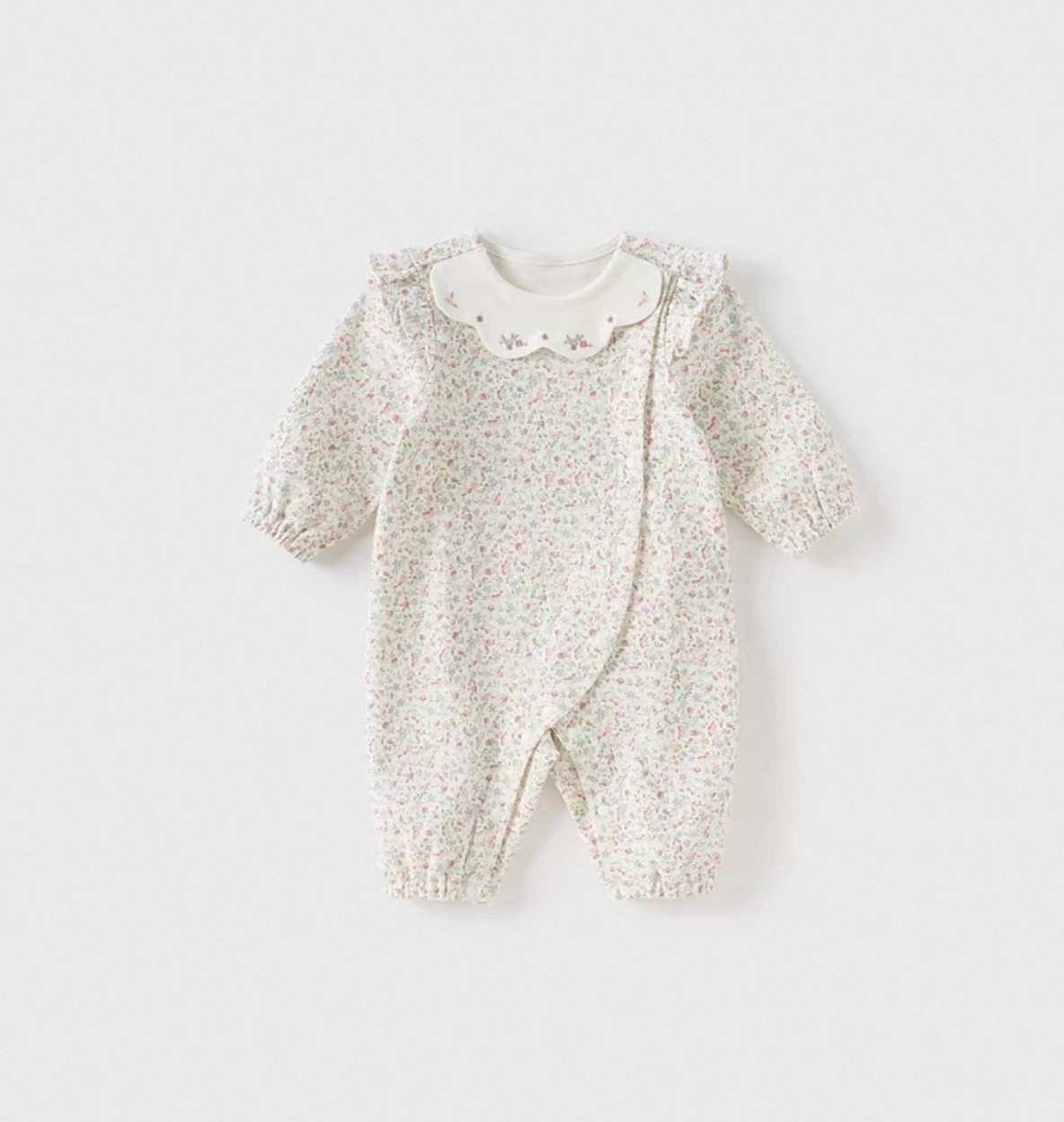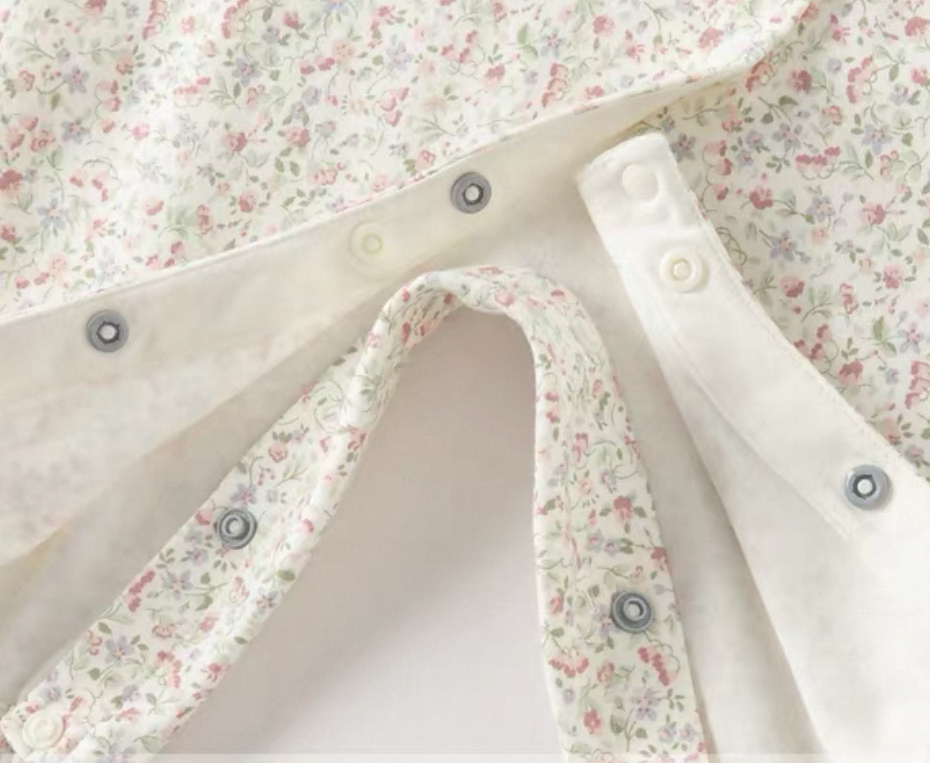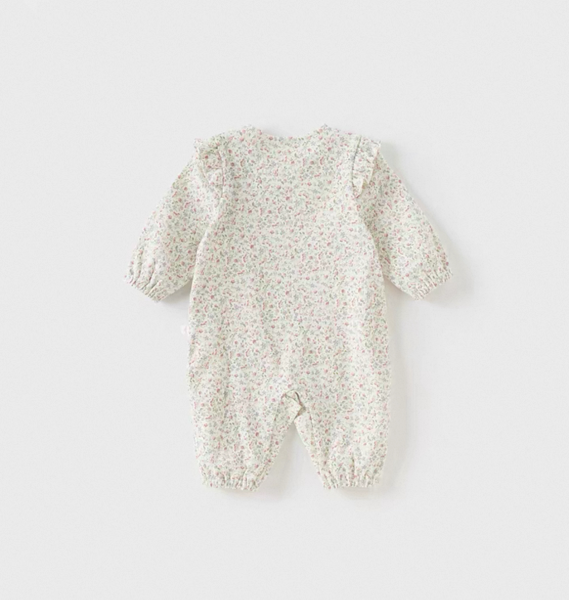 淡い色合いの小花柄が可憐な印象の、上品でナチュラルなロンパースです。