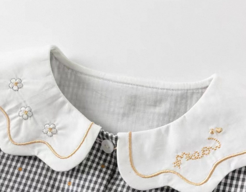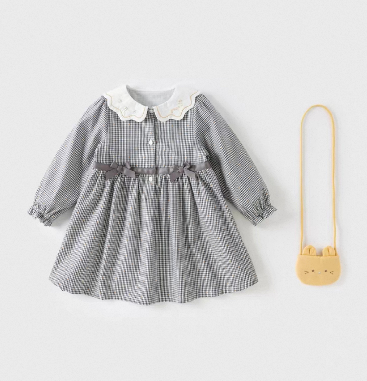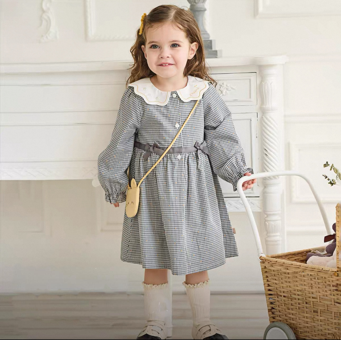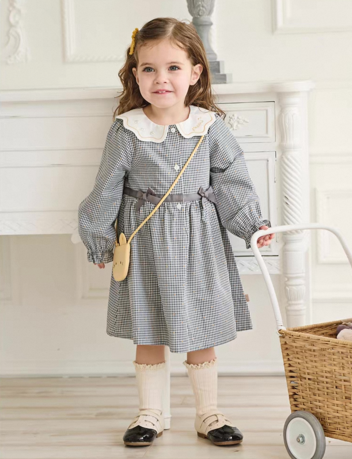 細かなギンガムチェック柄に、丸襟とリボンベルトをあしらった上品なデザインです。