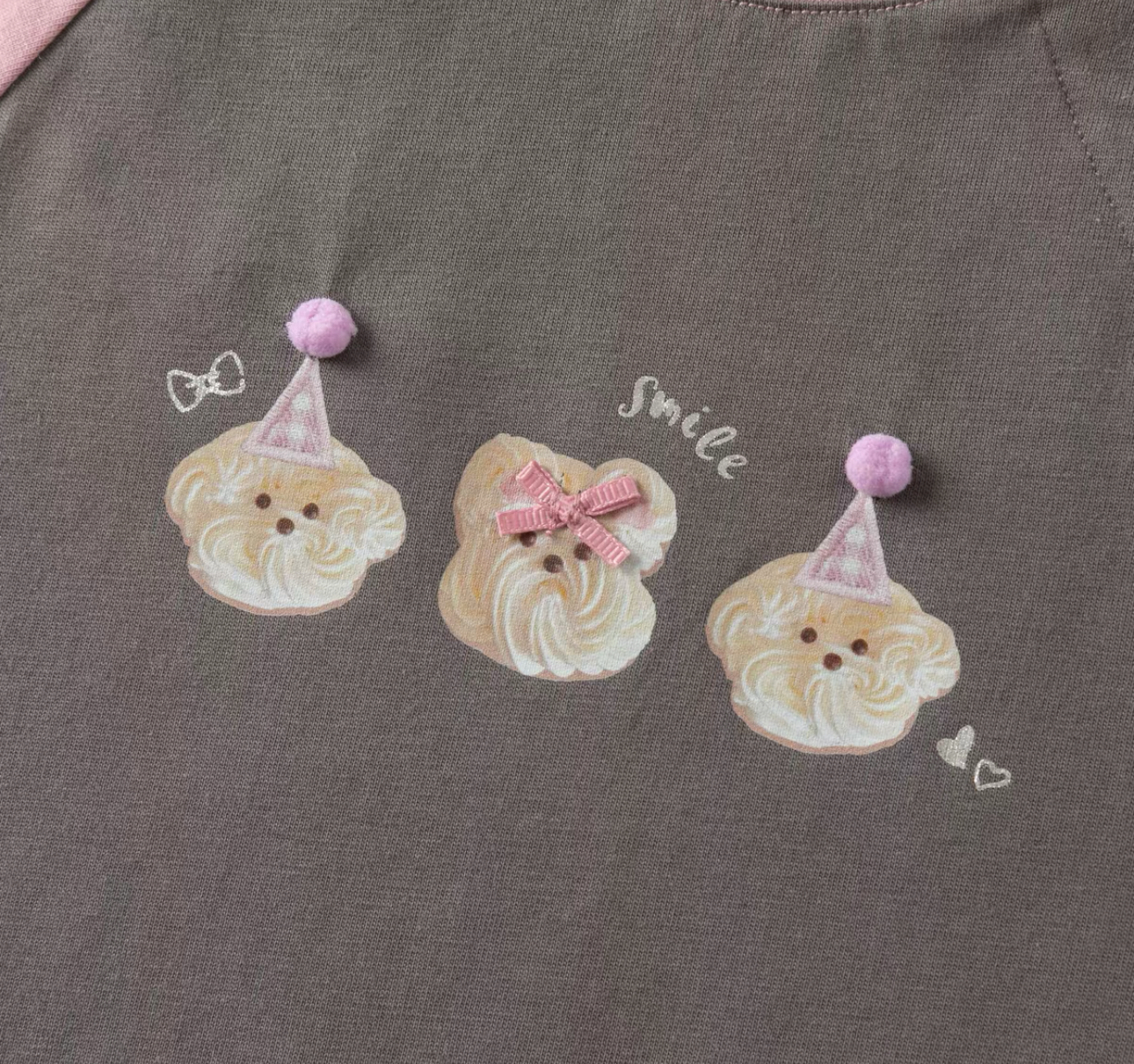 ふわっとした刺繍の質感と、パーティーハットの小さなポンポンがアクセントになった、遊び心あふれるデザインです。