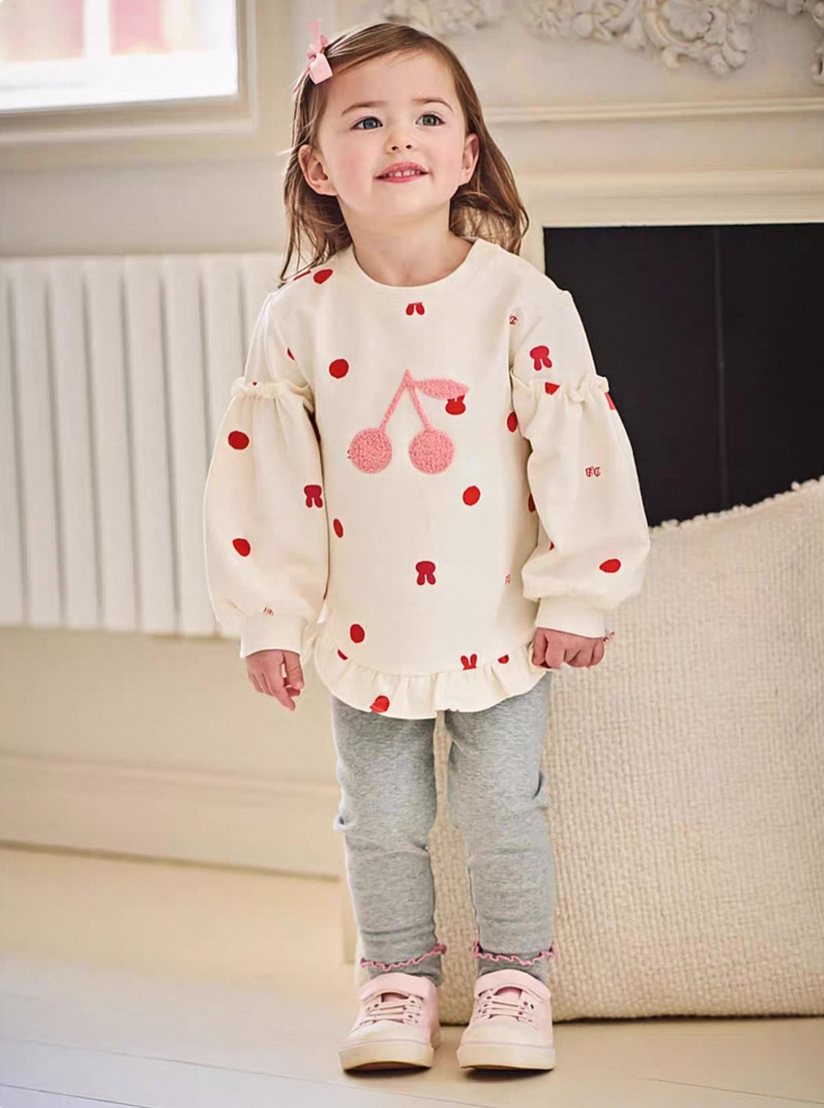 トップスには立体的なもこもこのチェリー刺繍があしらわれ、