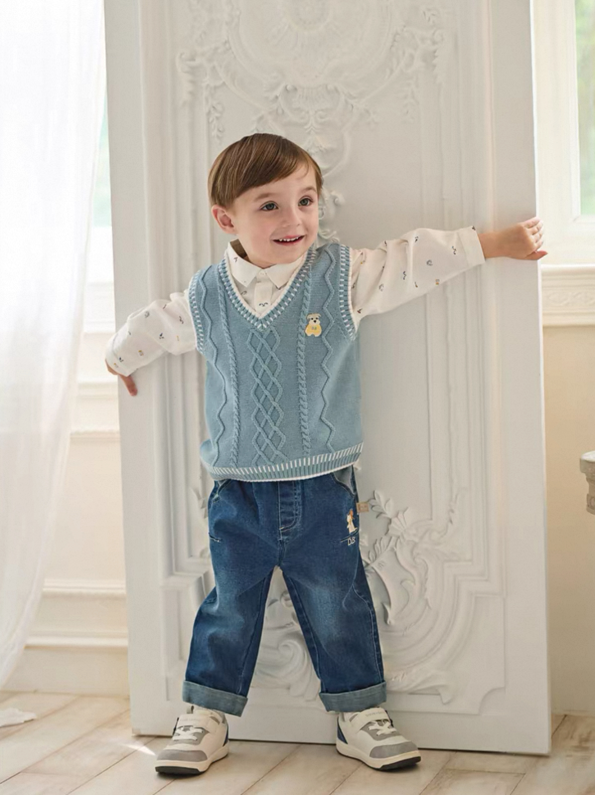 胸元には小さなアニマルモチーフの刺繍ワッペンがポイント。