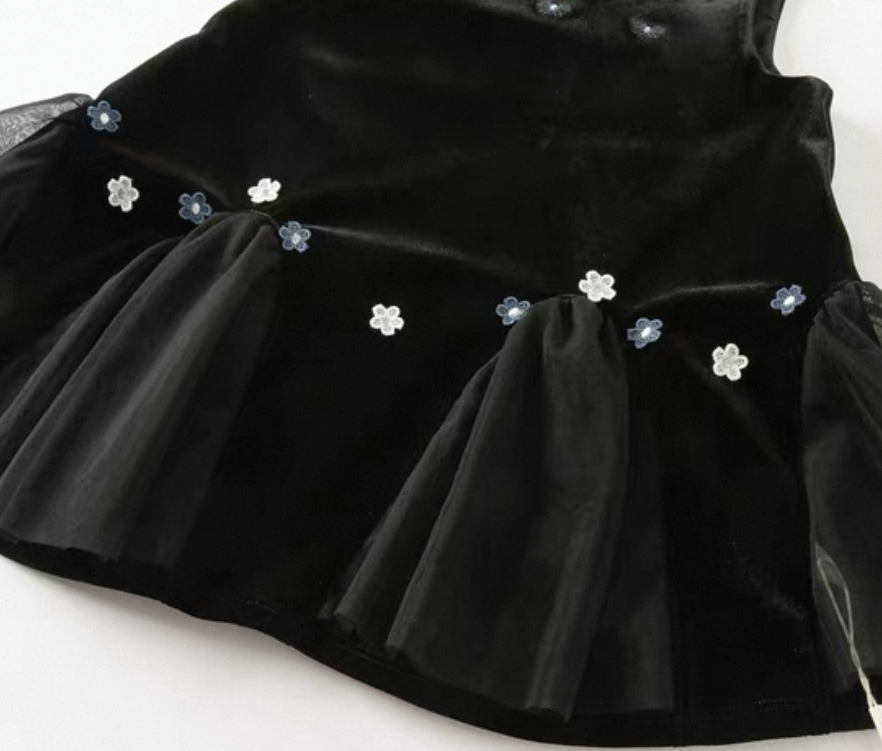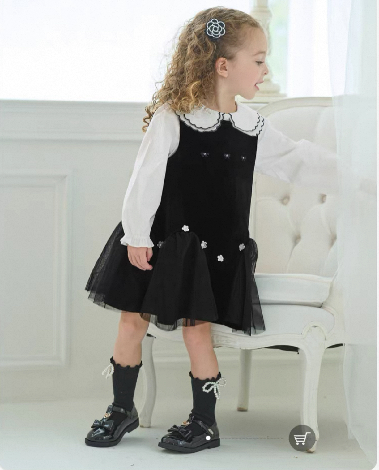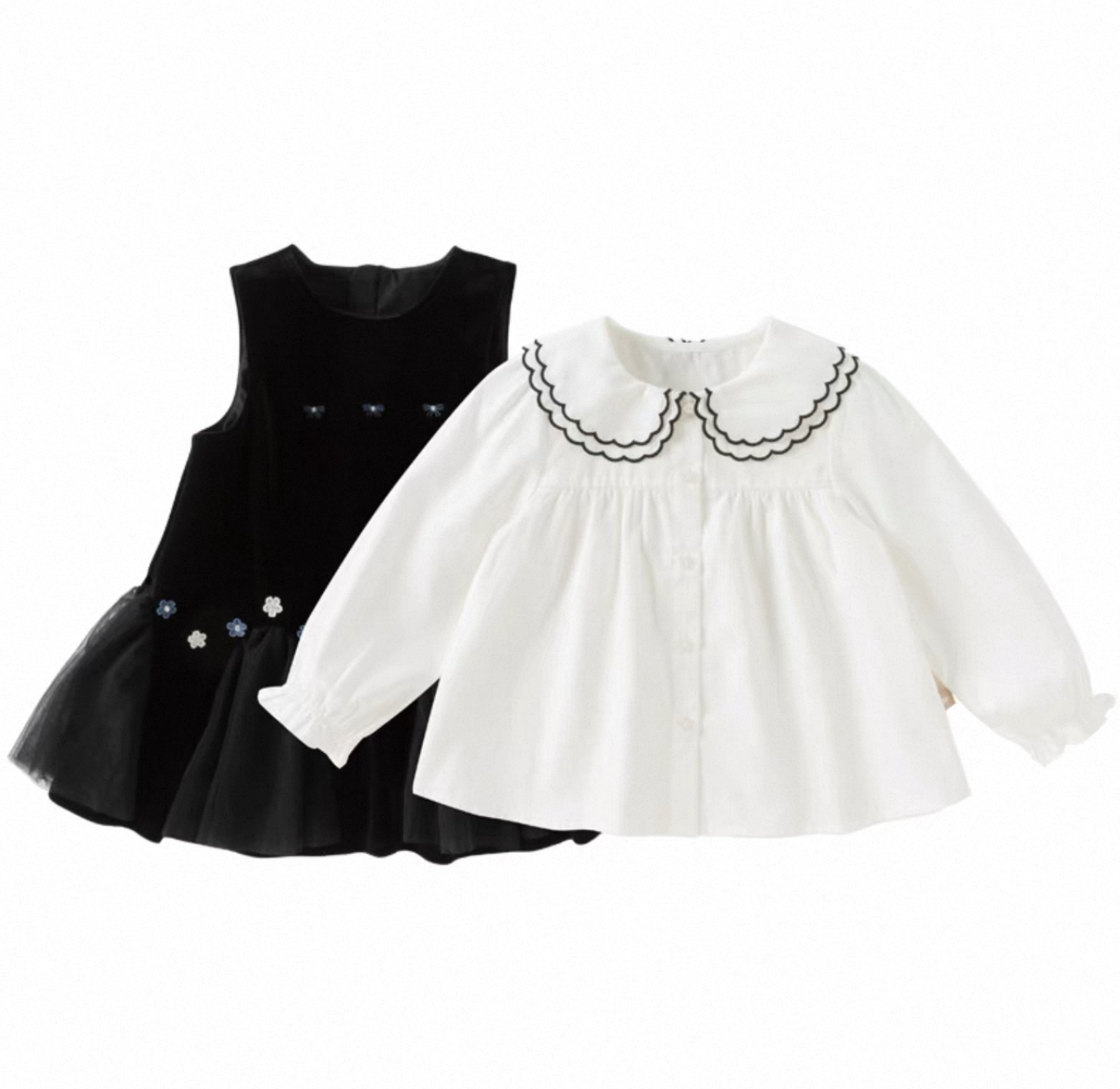 上品なベルベット調の黒ワンピースと、丸襟が可愛いホワイトブラウスの2点セットアイテムです。