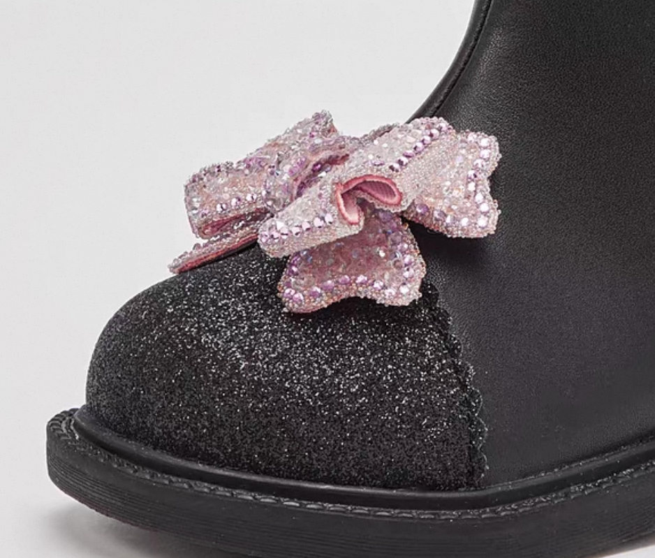 つま先にあしらった大きなピンクのビジューリボンが目を惹く、