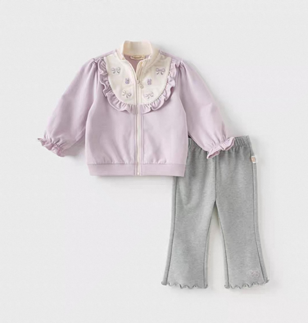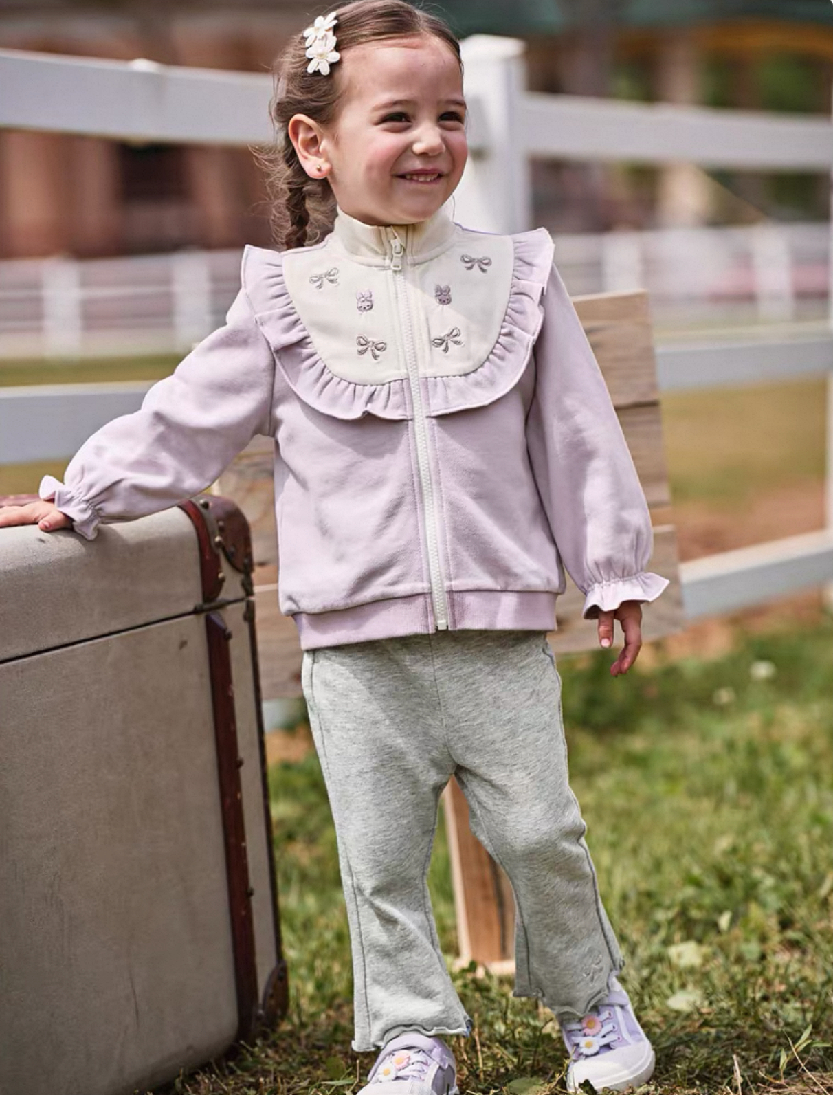 やさしいラベンダーカラーのトップスと、着回し抜群のグレーパンツがセットになった女の子向けセットアップです。