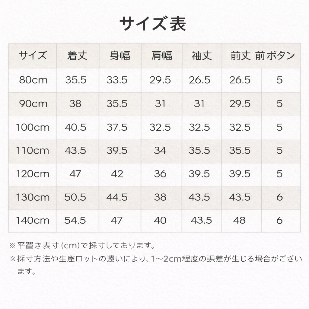 | サイズ | 着丈 | 身幅 | 肩幅 | 袖丈 | 前ボタン |