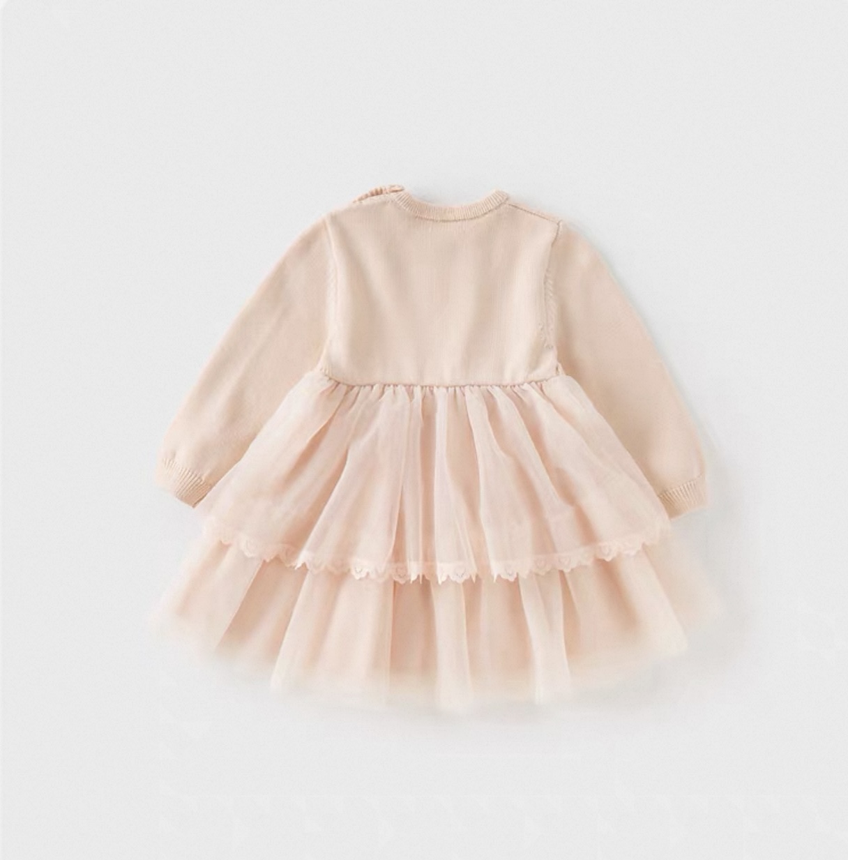 トップス部分は柔らかなニット素材で、スカートはふんわり広がるチュールの2段フリル仕上げになっています。