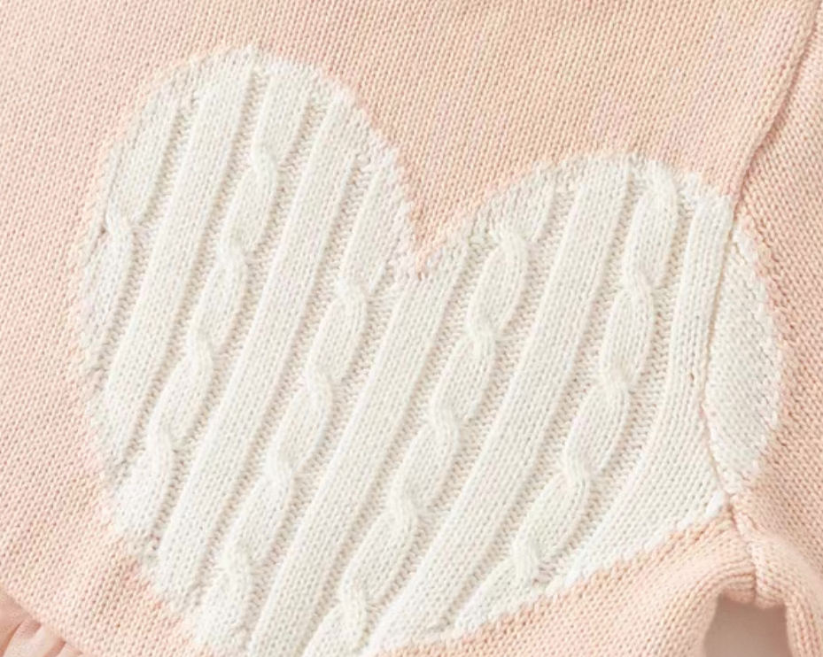 胸元の大きなハートの編み模様が目を引く、ガーリー度満点のワンピースです。