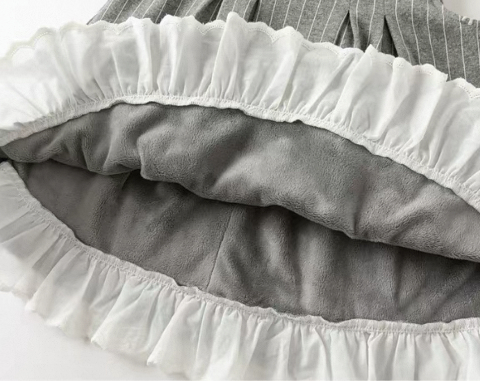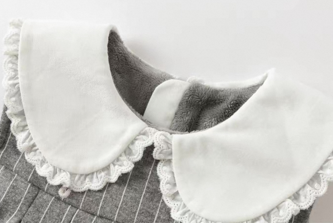 白い丸襟にはさりげないフリルがあしらわれ、着るだけで清楚で可愛らしい雰囲気に仕上がります。