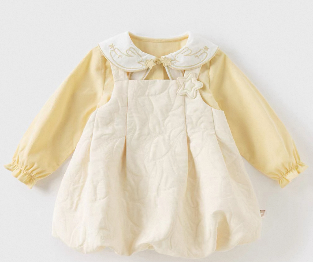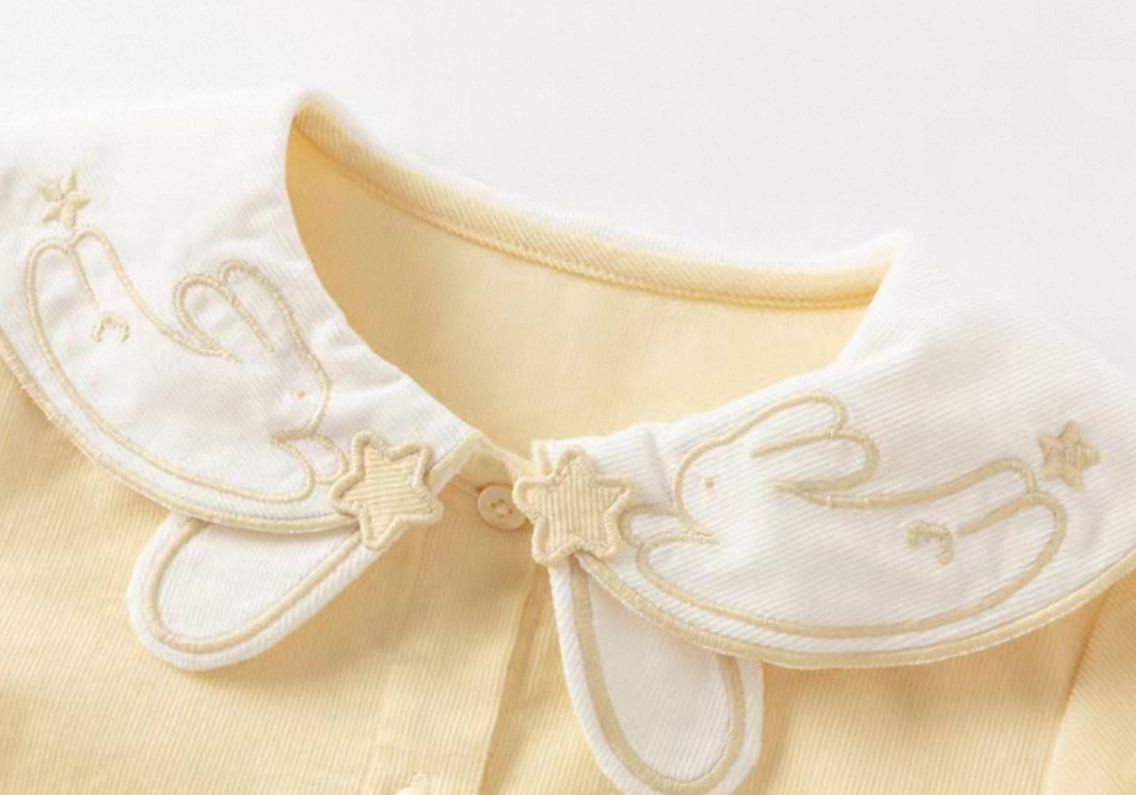 存在感のある大きめの丸襟には、お花や星の刺繍があしらわれ、顔まわりを華やかにしてくれます。