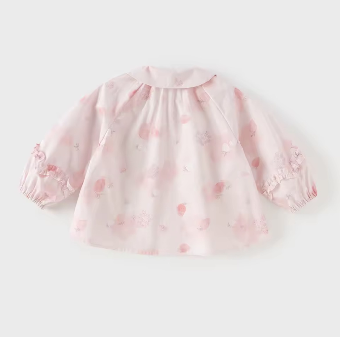 丸みのある襟や、袖口のフリルが