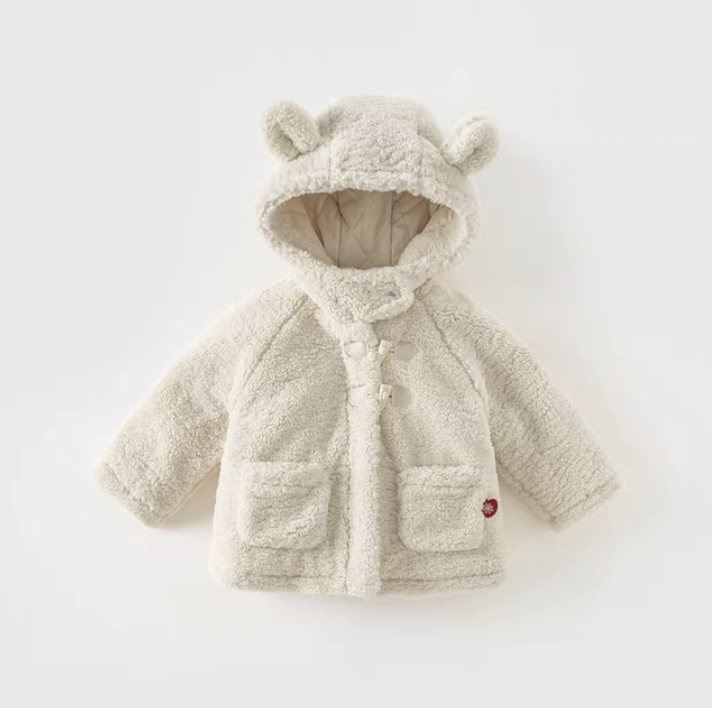 もこもこ素材がかわいいくま耳ダッフルコートです。