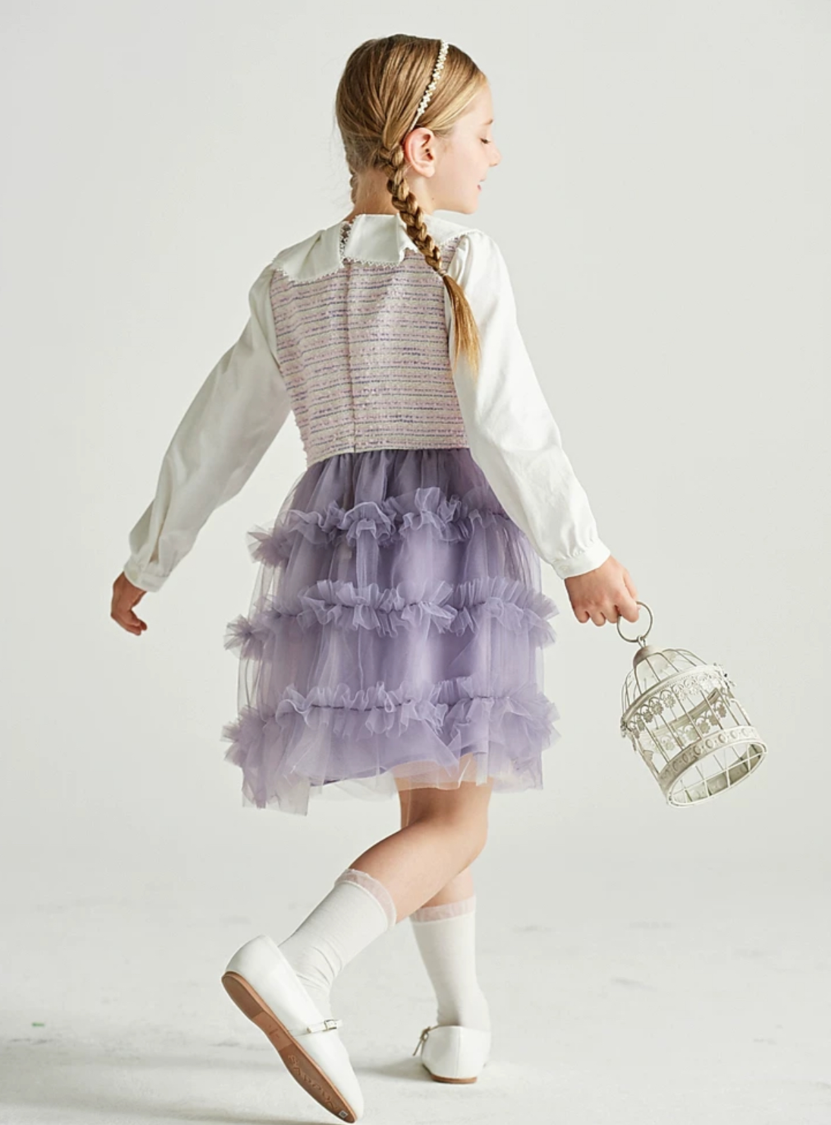 ラベンダーカラーがおしゃれなチュールドッキングワンピースです。