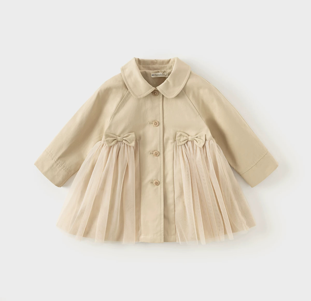 チュールがドッキングされた大人顔負けなトレンチコートです。