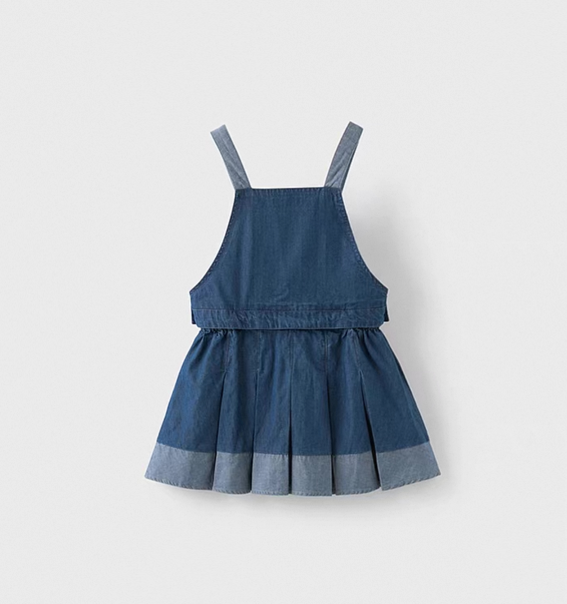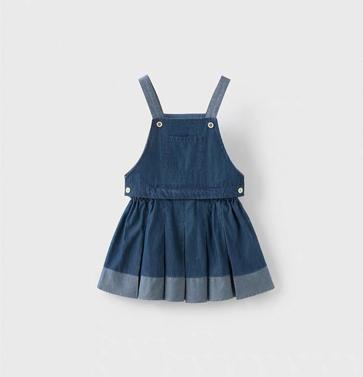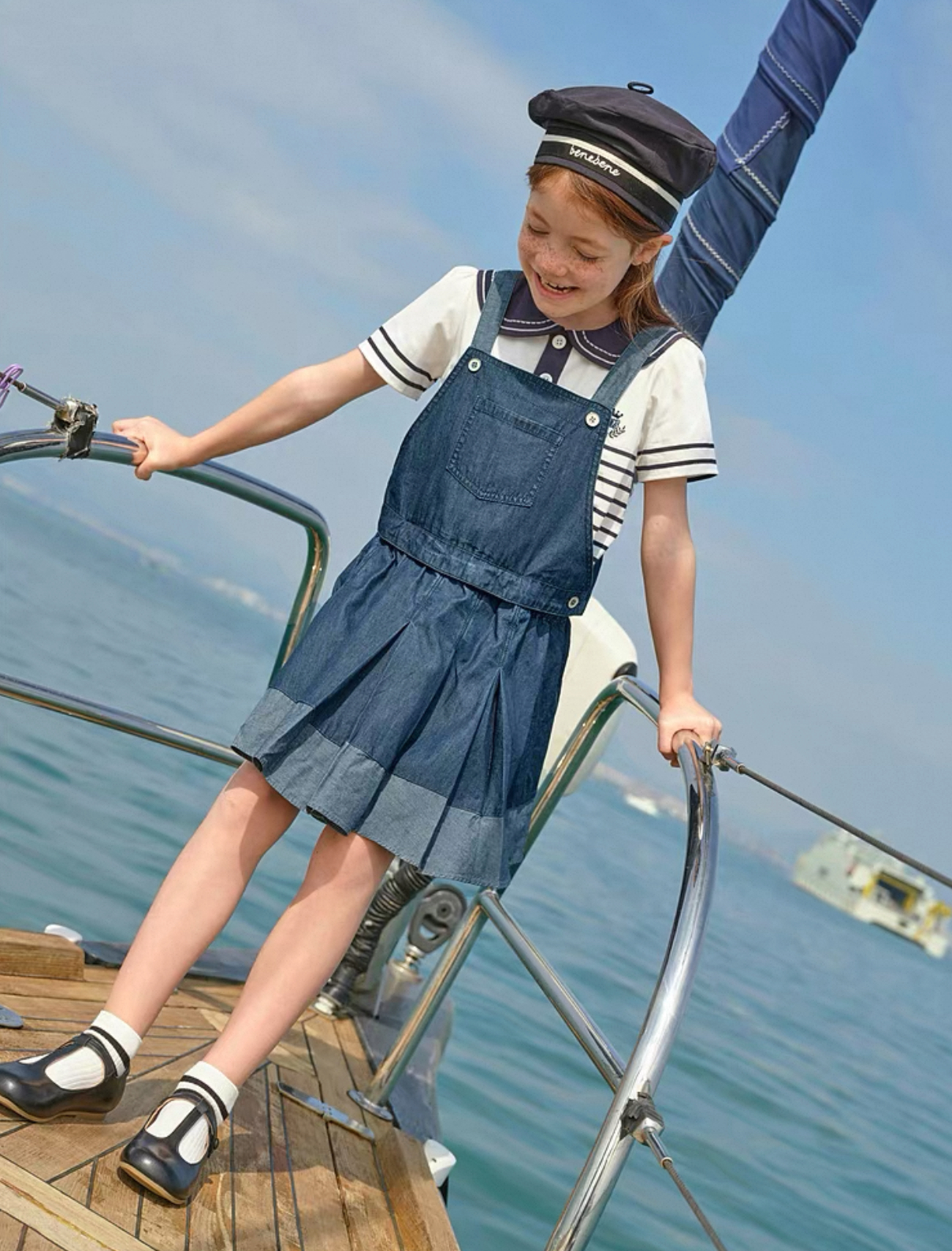 胸元には便利なポケット付きで実用性もあり、肩紐のデザインが元気な印象をプラスしています。