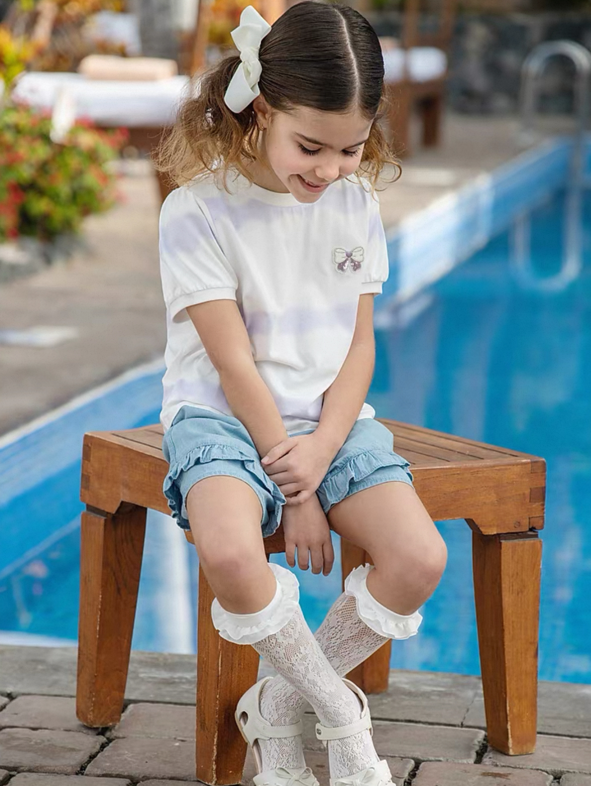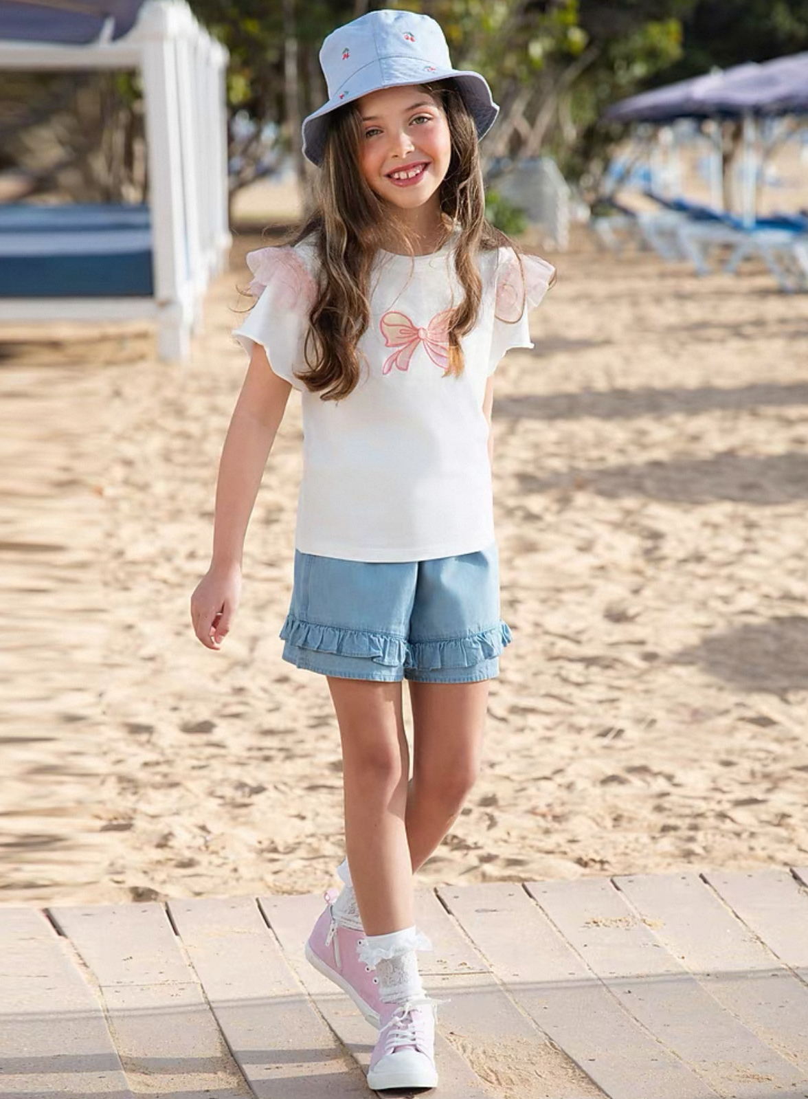 ライトブルーのデニム風素材でカジュアルさと可愛らしさを両立しました。