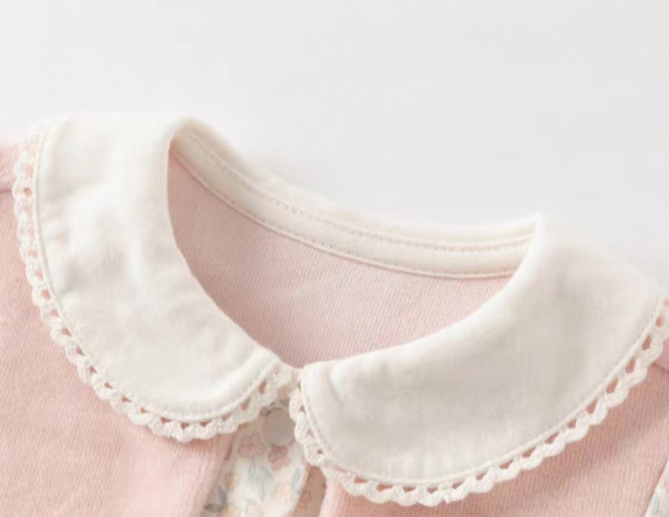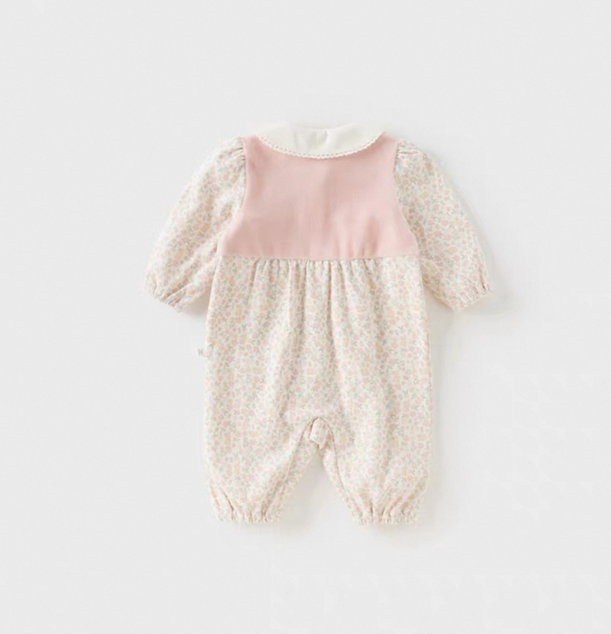 全体に繊細な小花柄をあしらった、ガーリーで愛らしいロンパースです。