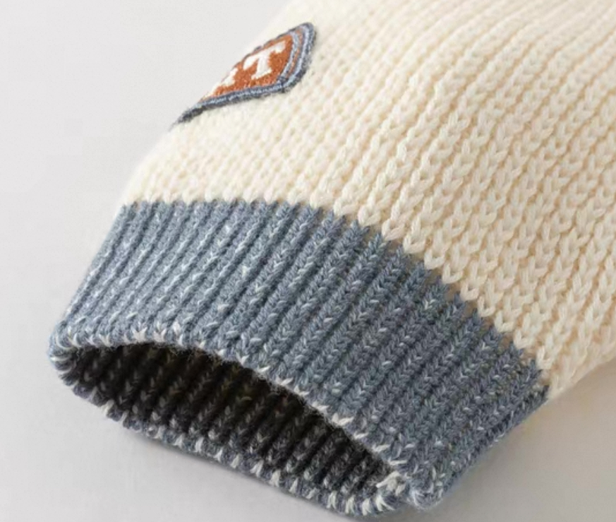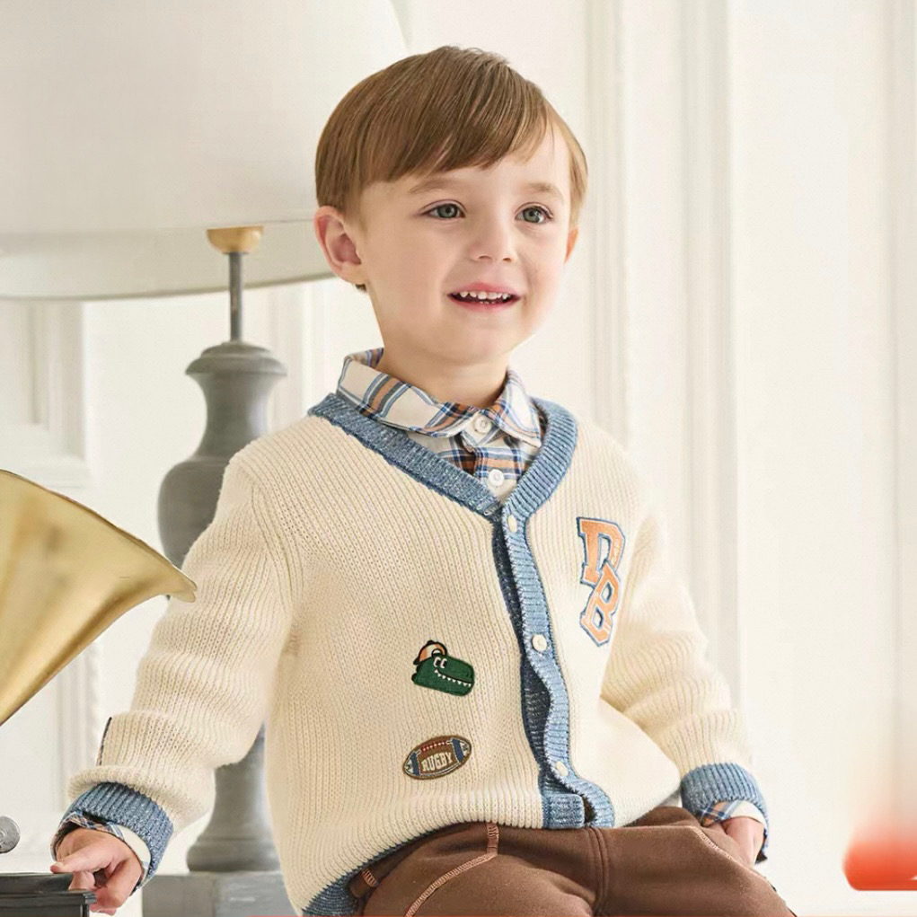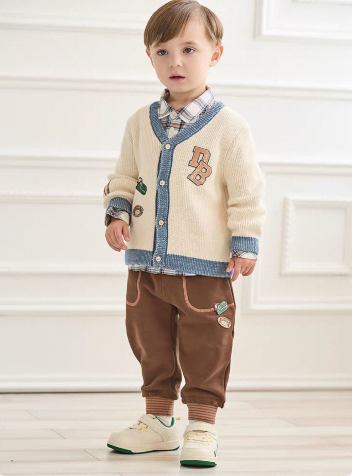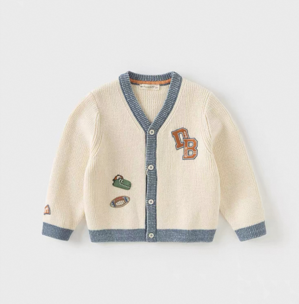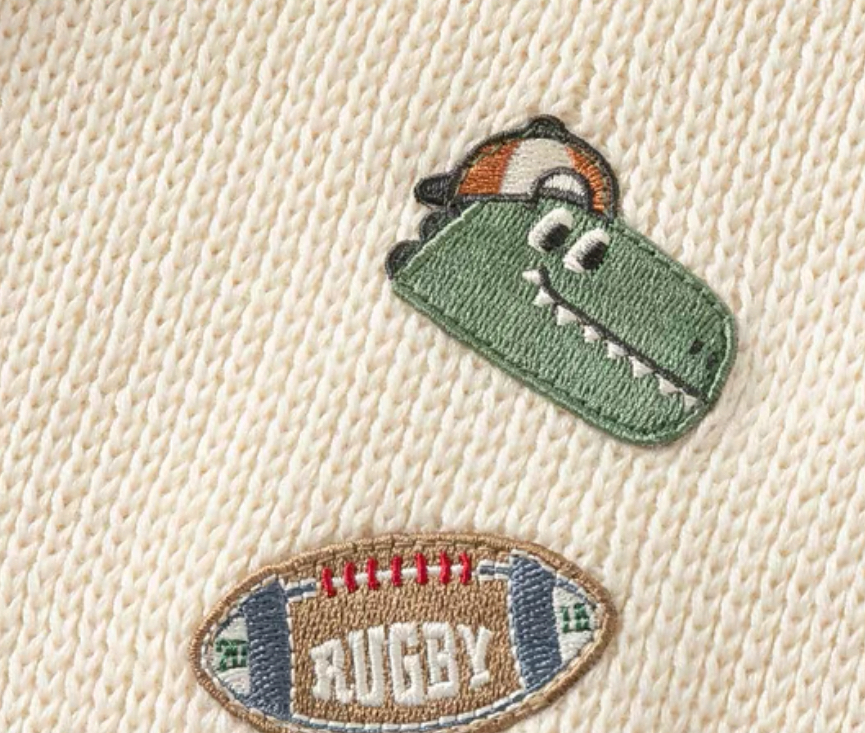 胸元には「DB」のカレッジ風ロゴ、ラグビーボールやシューズなどのワッペン風刺繍が施され、スポーティーかつ遊び心のある仕上がりになっています。