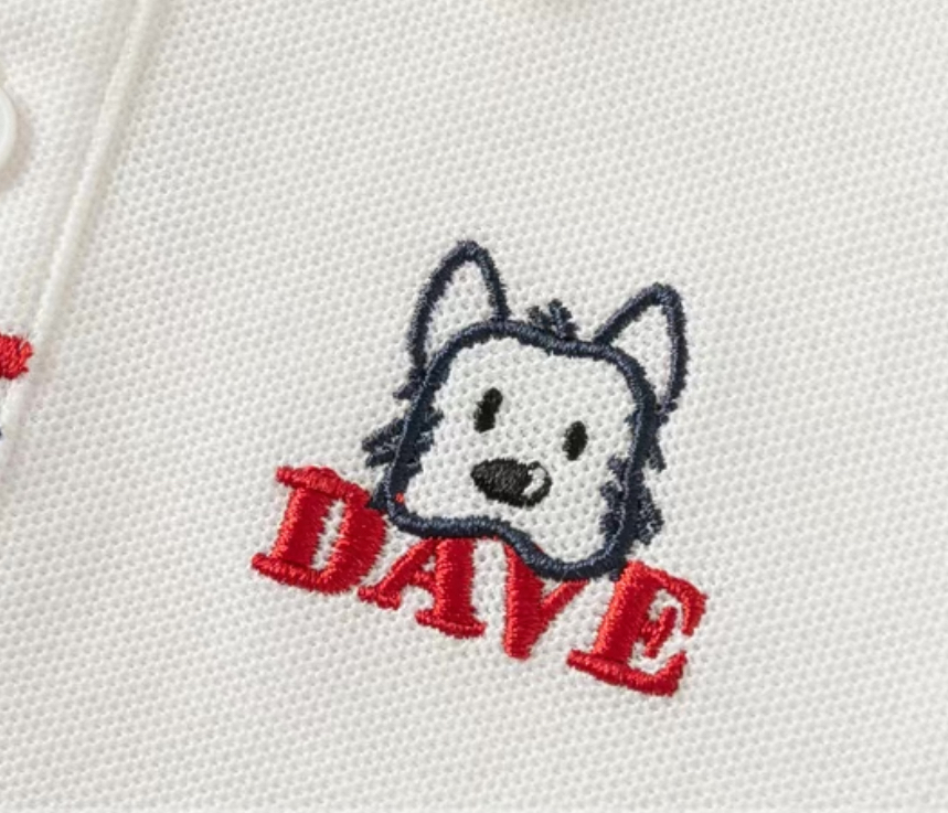 胸元には犬のワンポイント刺繍と「DAVE」のロゴ入りで、さりげない遊び心が光るデザインです。