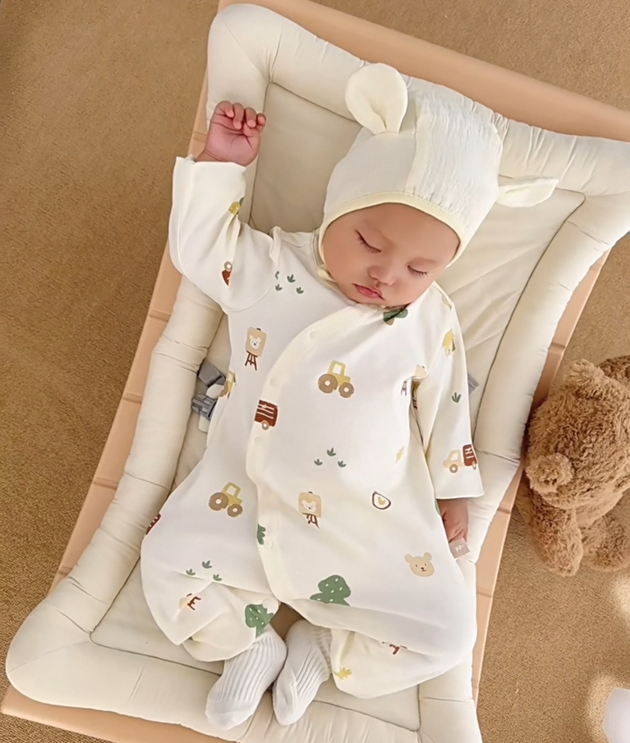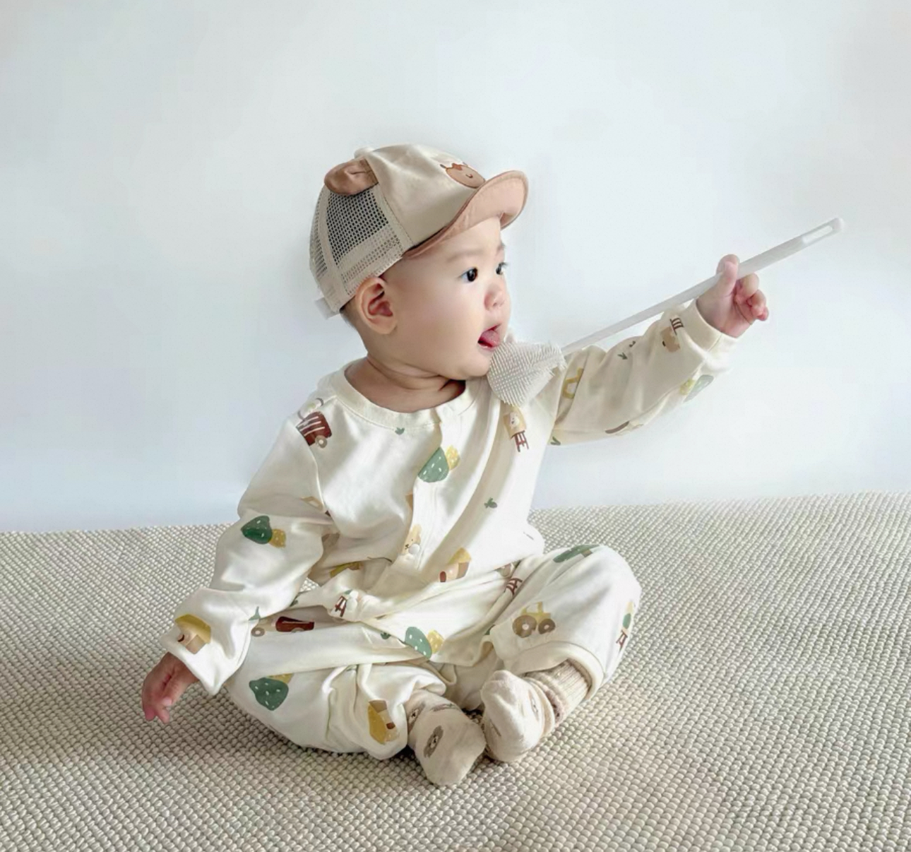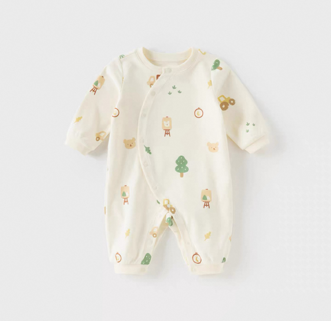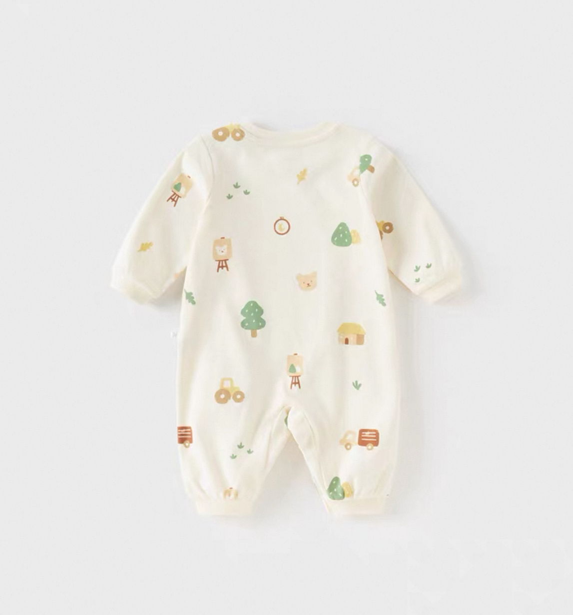 動物やお野菜、木などの愛らしいイラストがちりばめられた総柄デザインで、赤ちゃんの可愛さをさらに引き立ててくれます。