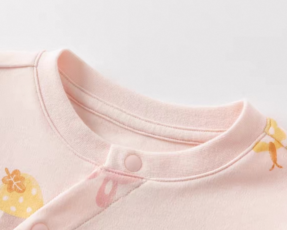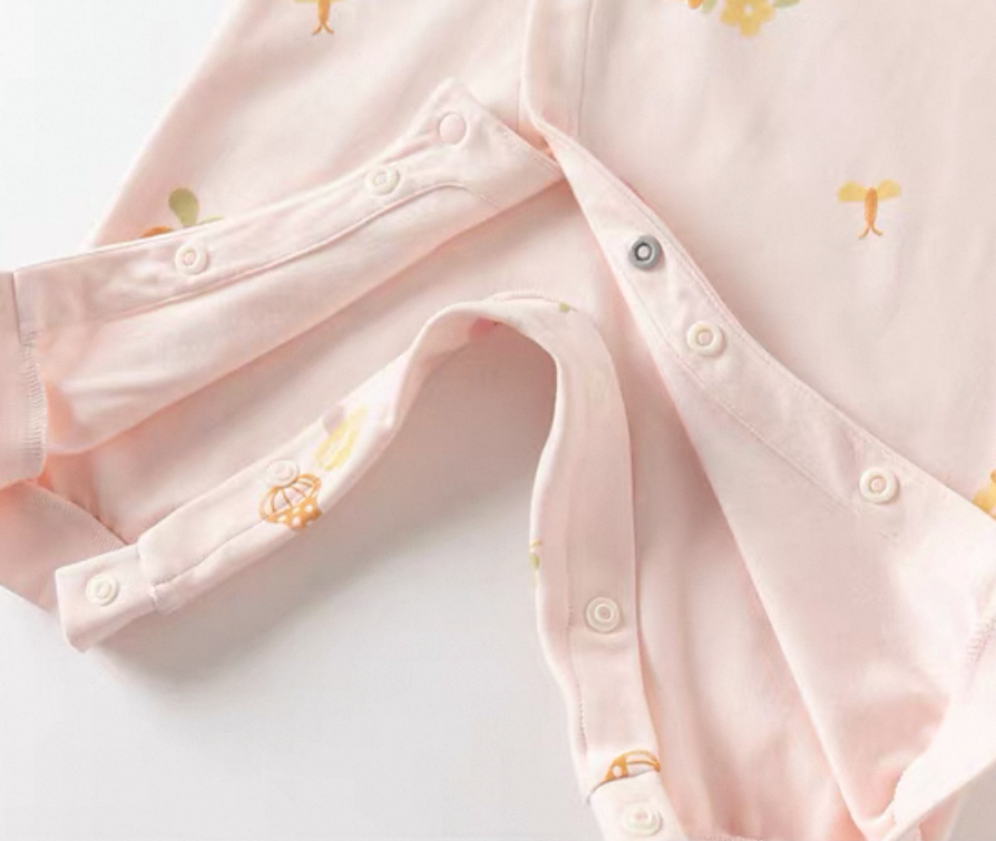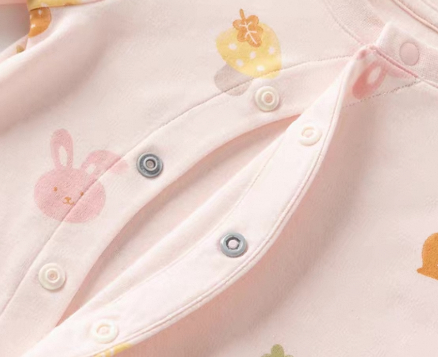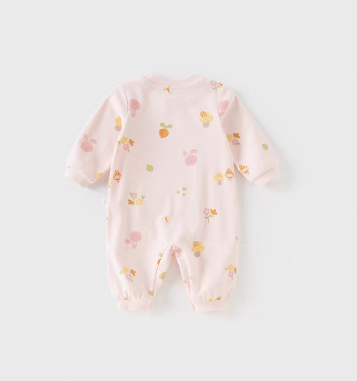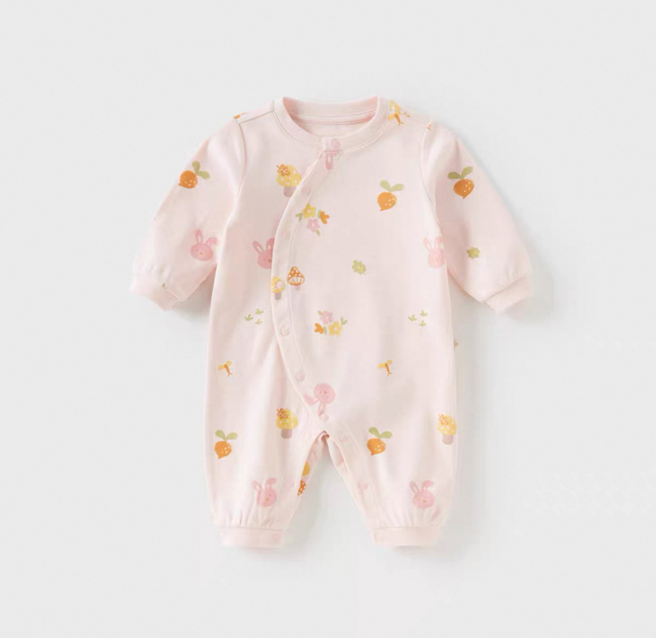 動物やお野菜、木などの愛らしいイラストがちりばめられた総柄デザインで、赤ちゃんの可愛さをさらに引き立ててくれます。