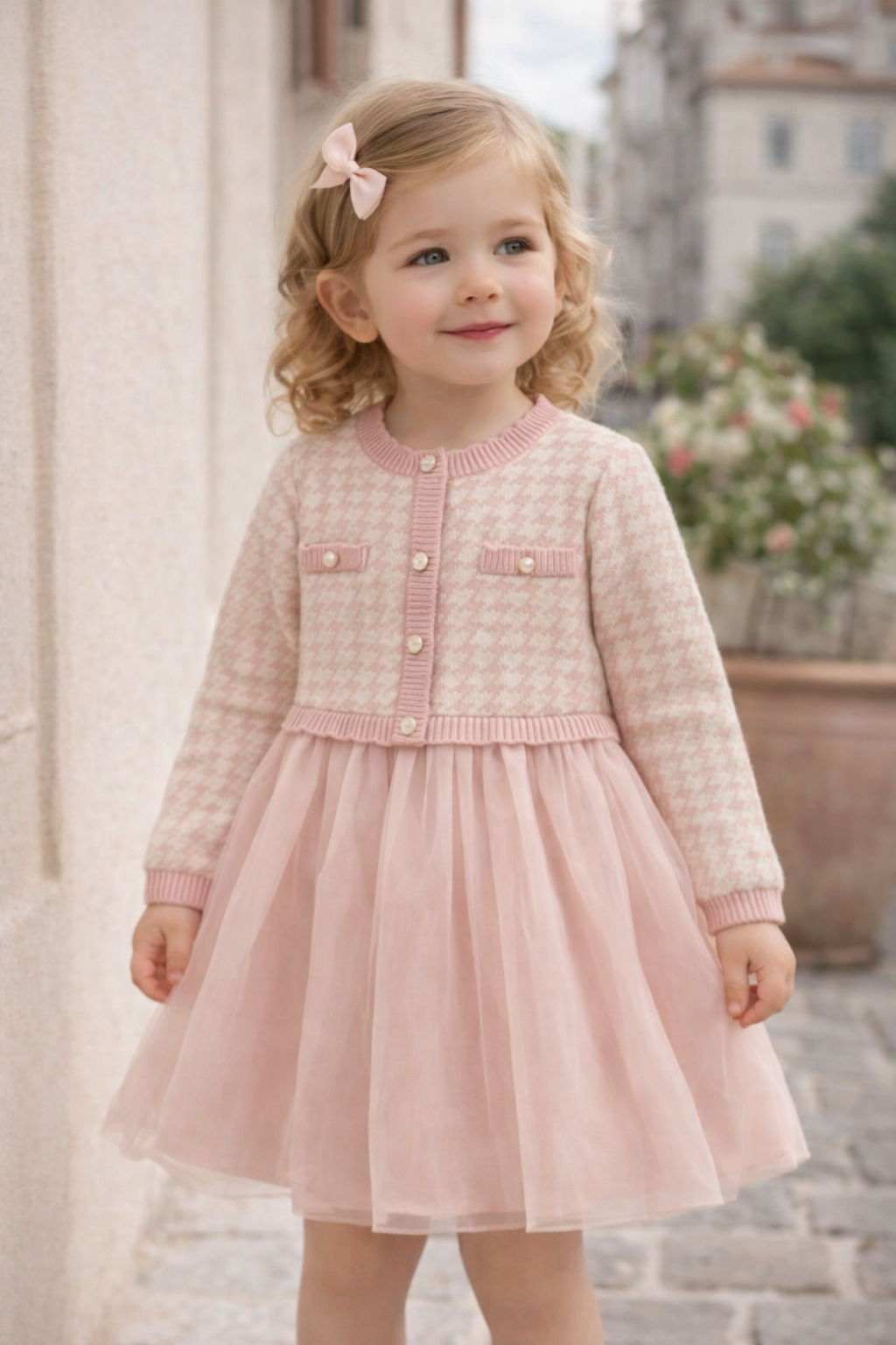 上品なピンクの千鳥格子ニットと、ふんわり広がるチュールスカートがドッキングしたドレス風ワンピースです。