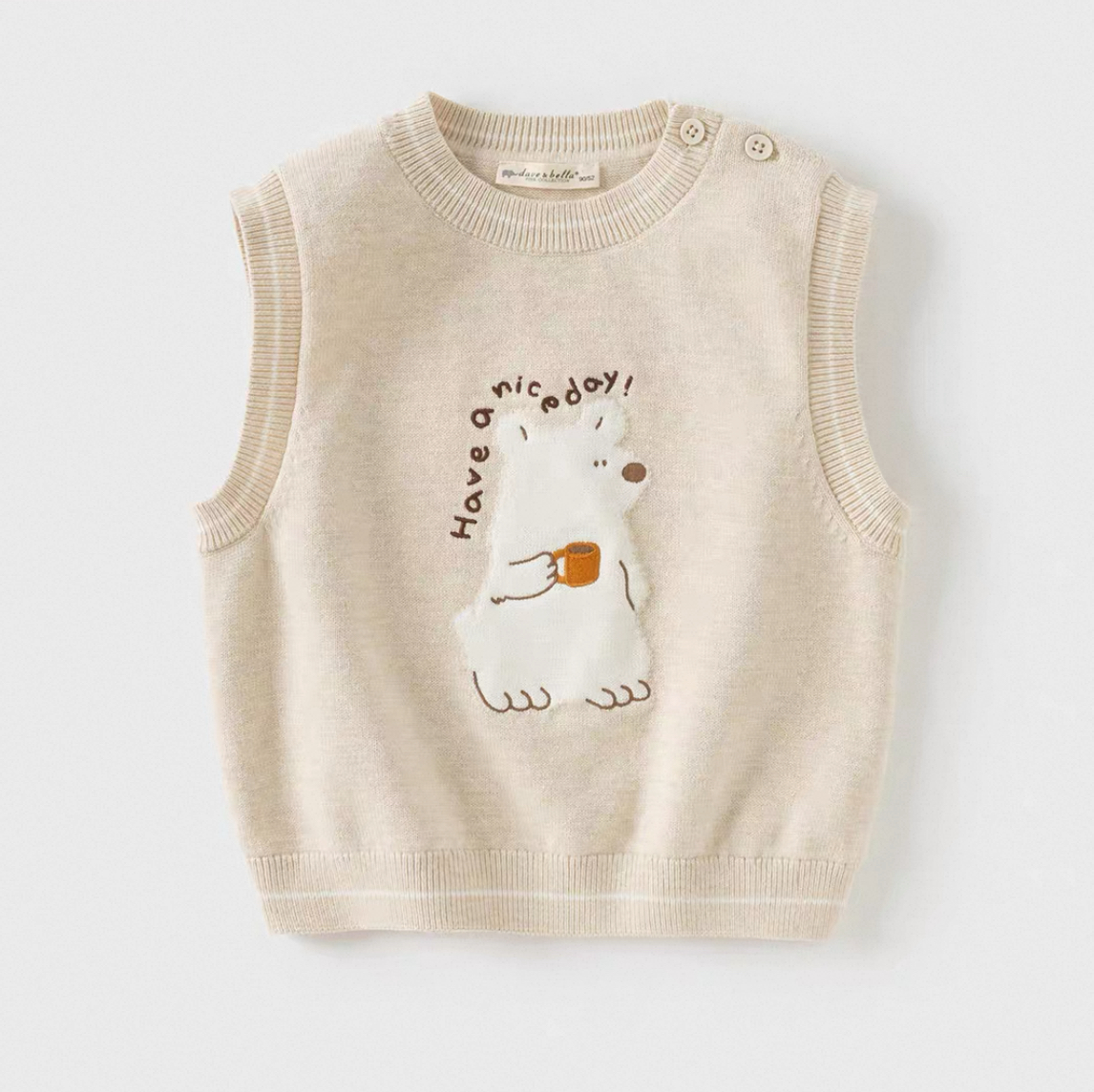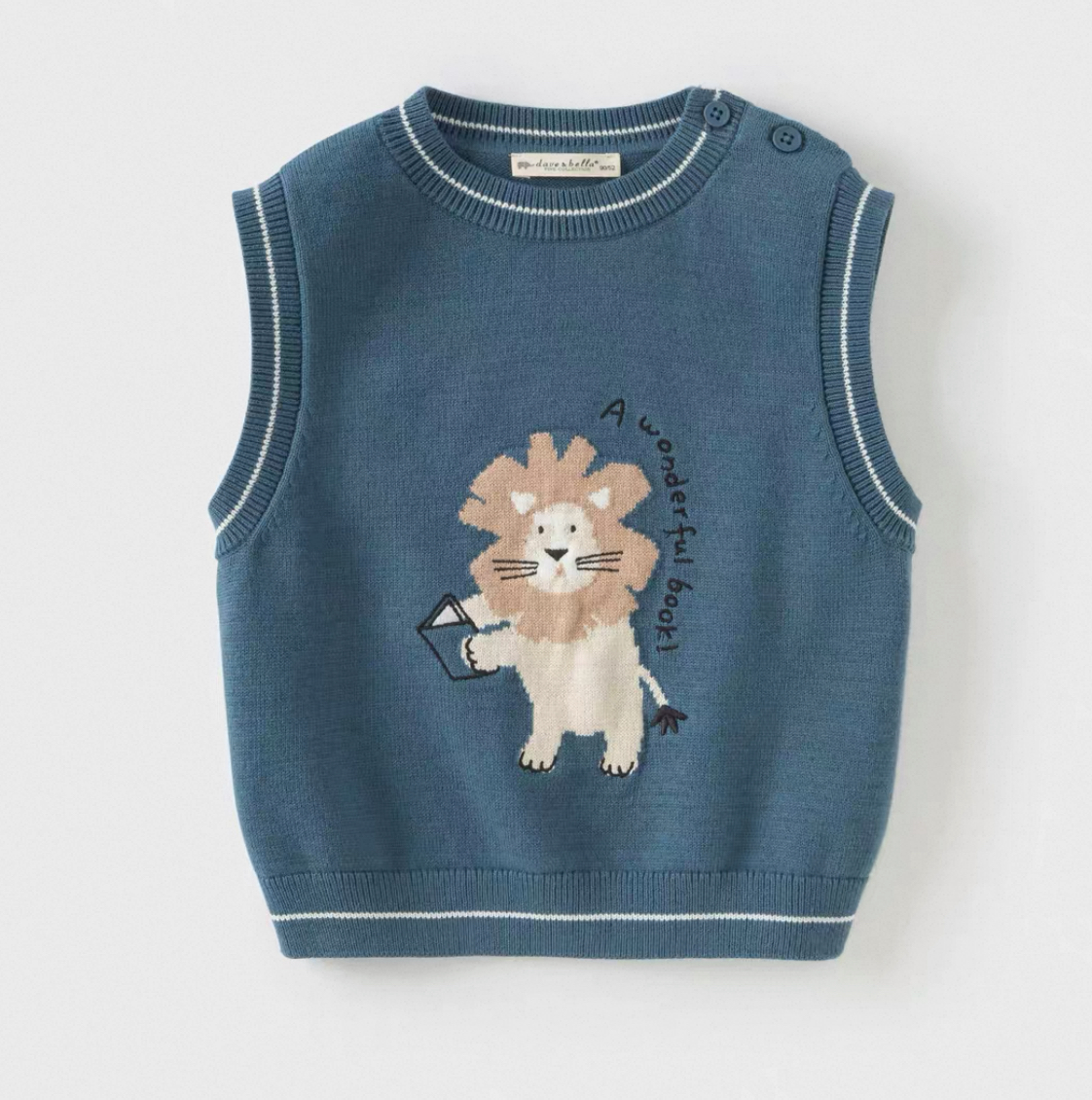 やわらかい色合いと可愛らしい動物モチーフがポイントの 3色展開ニットベスト です。