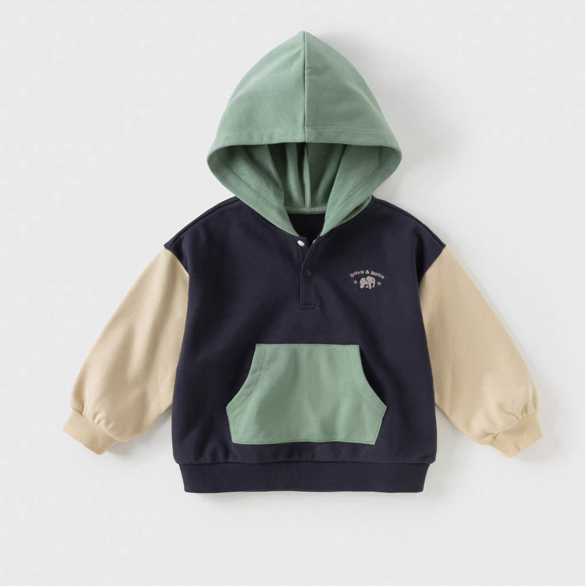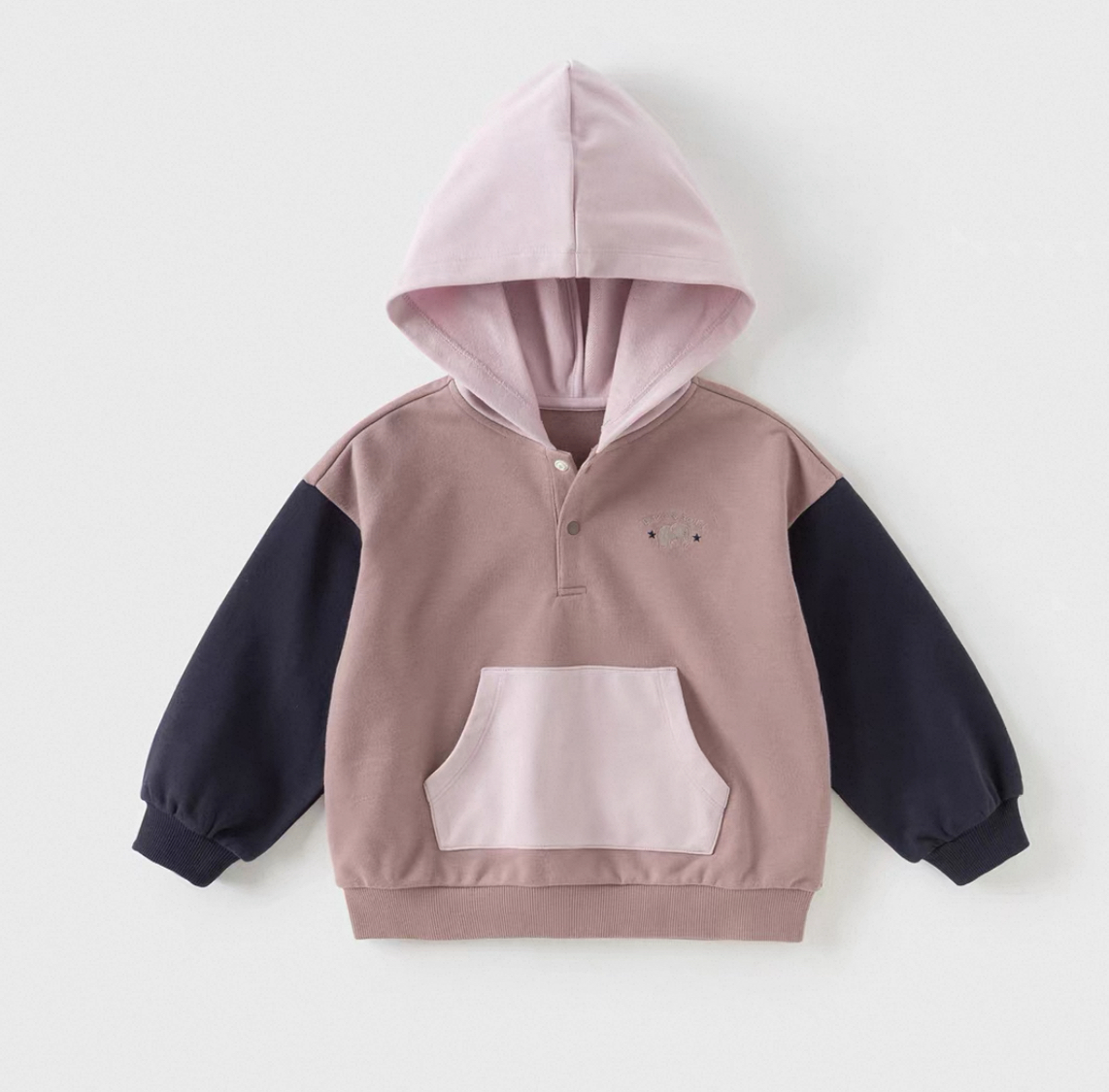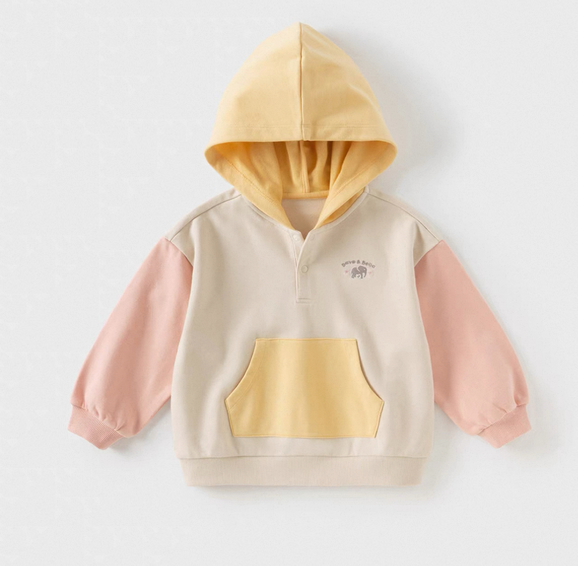 やわらかなカラーリングが可愛い、バイカラーデザインのキッズフーディです。