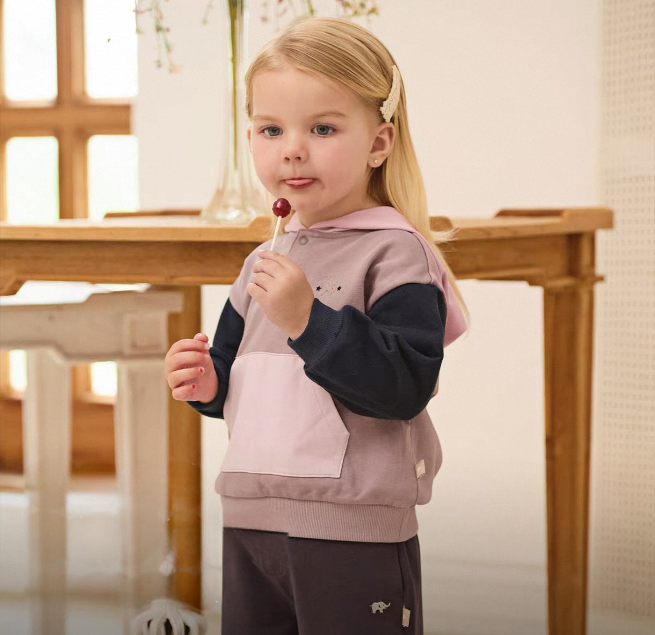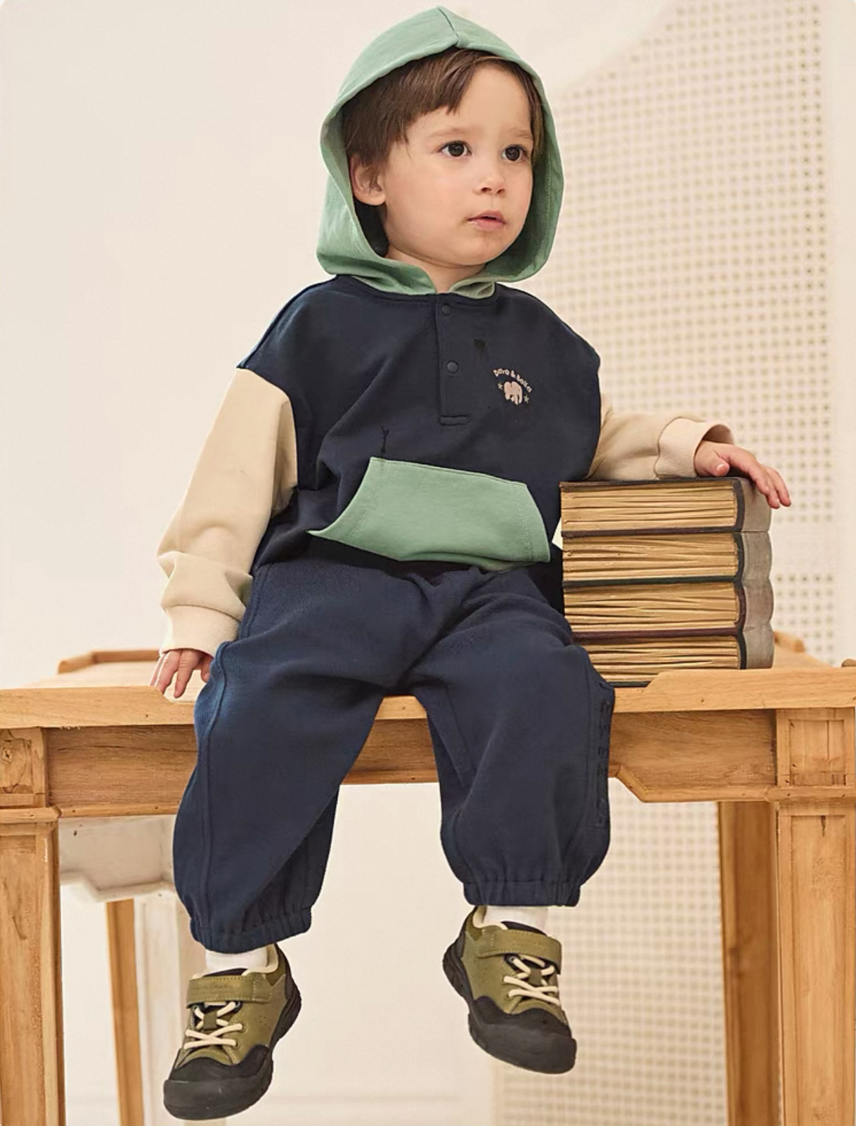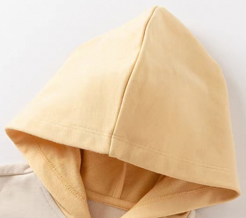 やわらかなカラーリングが可愛い、バイカラーデザインのキッズフーディです。