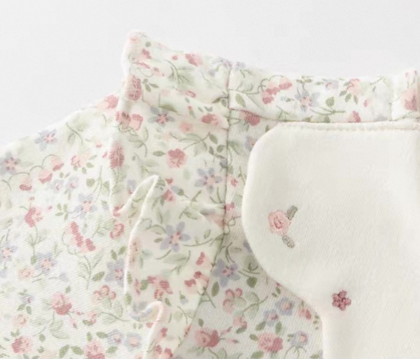 淡い色合いの小花柄が可憐な印象の、上品でナチュラルなロンパースです。