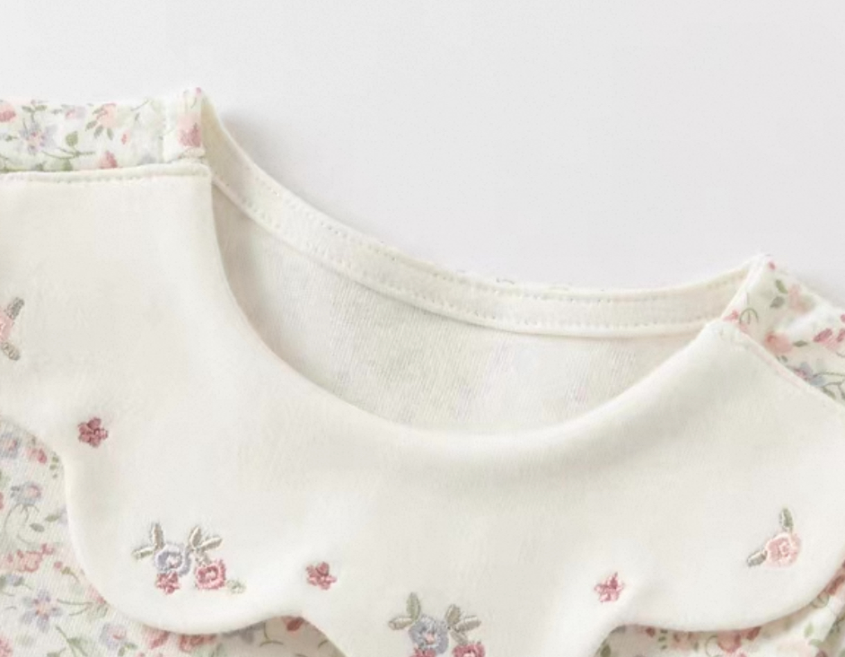 襟元にはスカラップ刺繍入りの丸襟をあしらい、顔まわりを華やかにしてくれます。