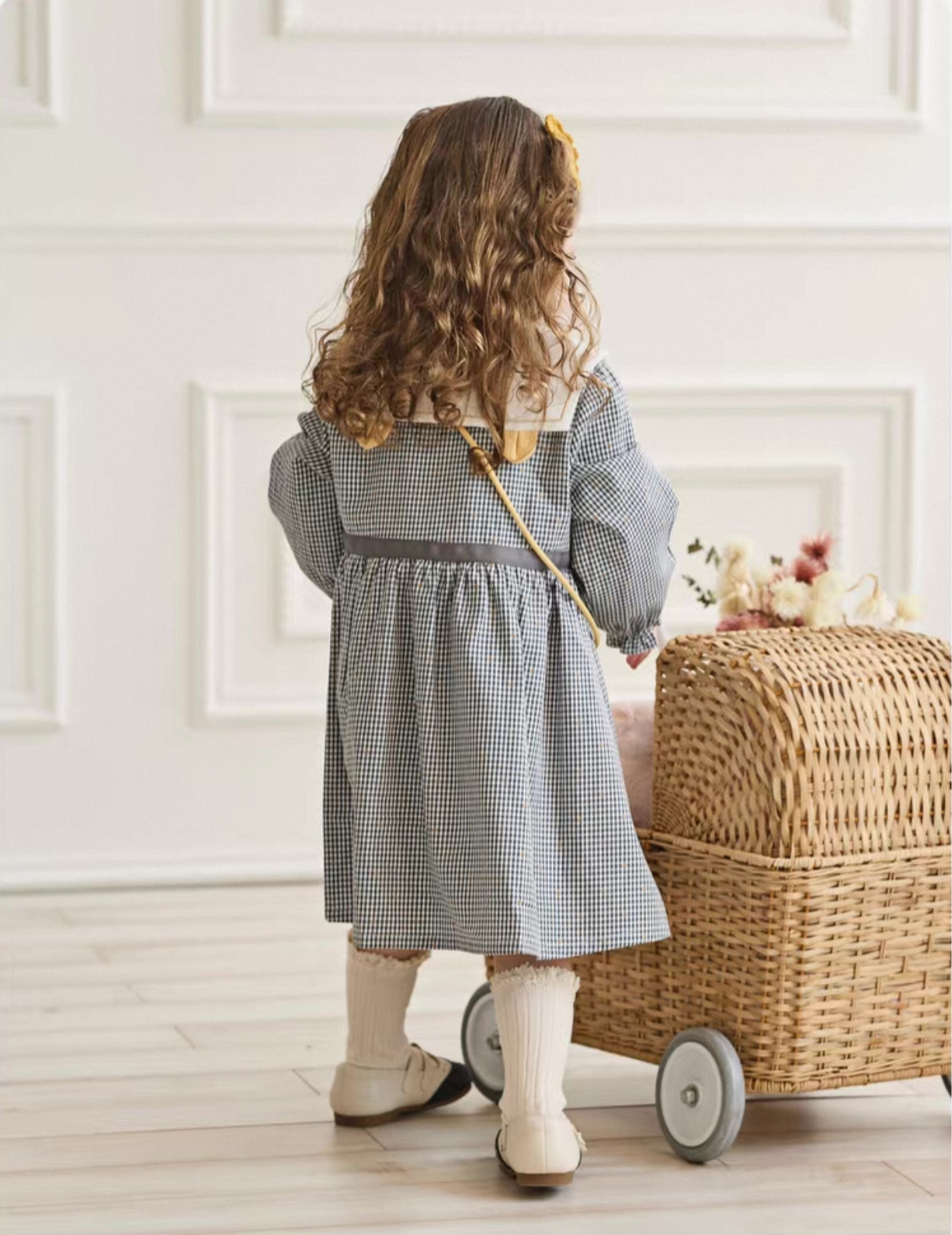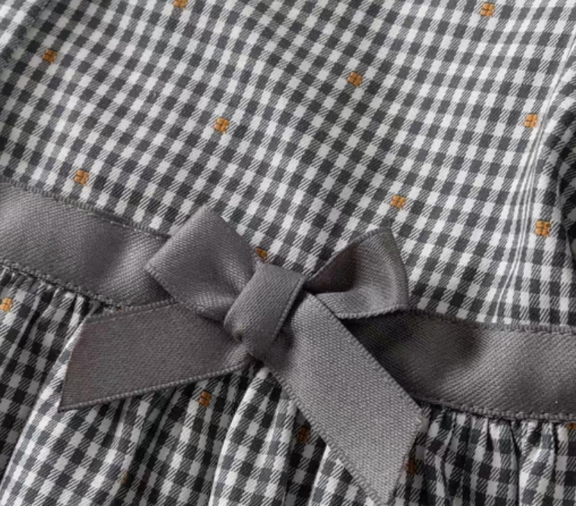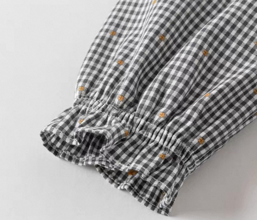 細かなギンガムチェック柄に、丸襟とリボンベルトをあしらった上品なデザインです。