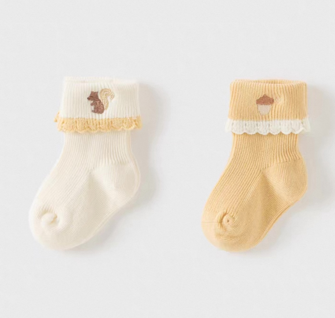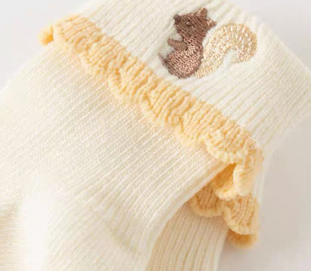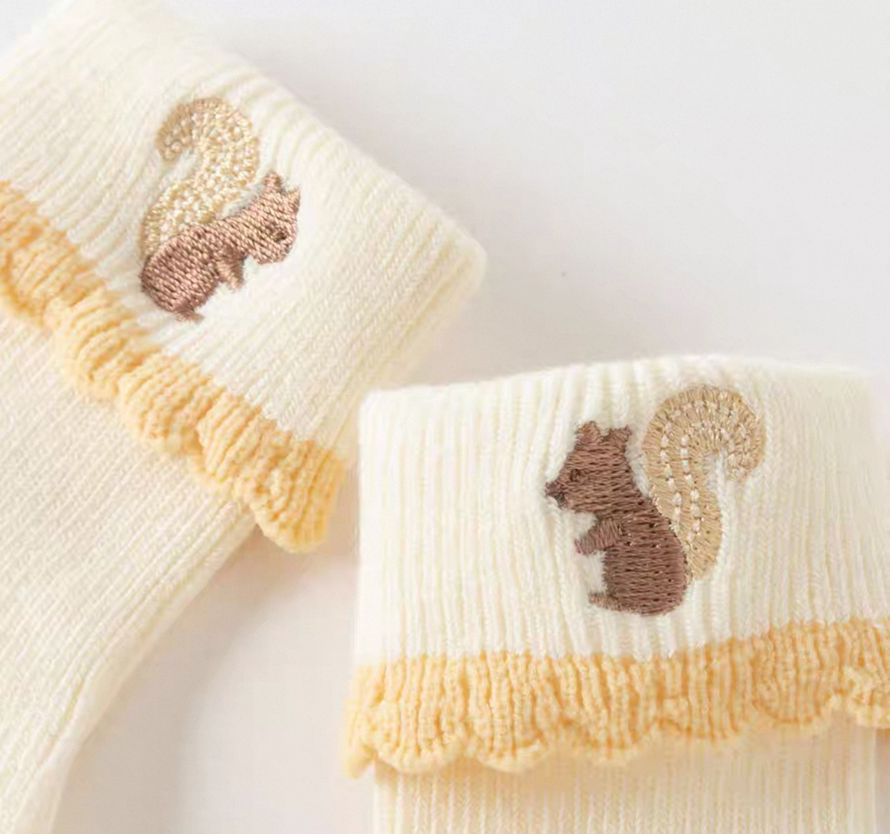 それぞれの靴下には、小さな森の仲間モチーフを刺繍が施されています。