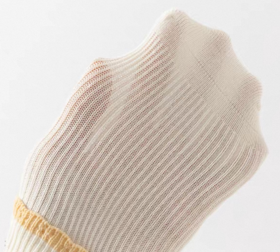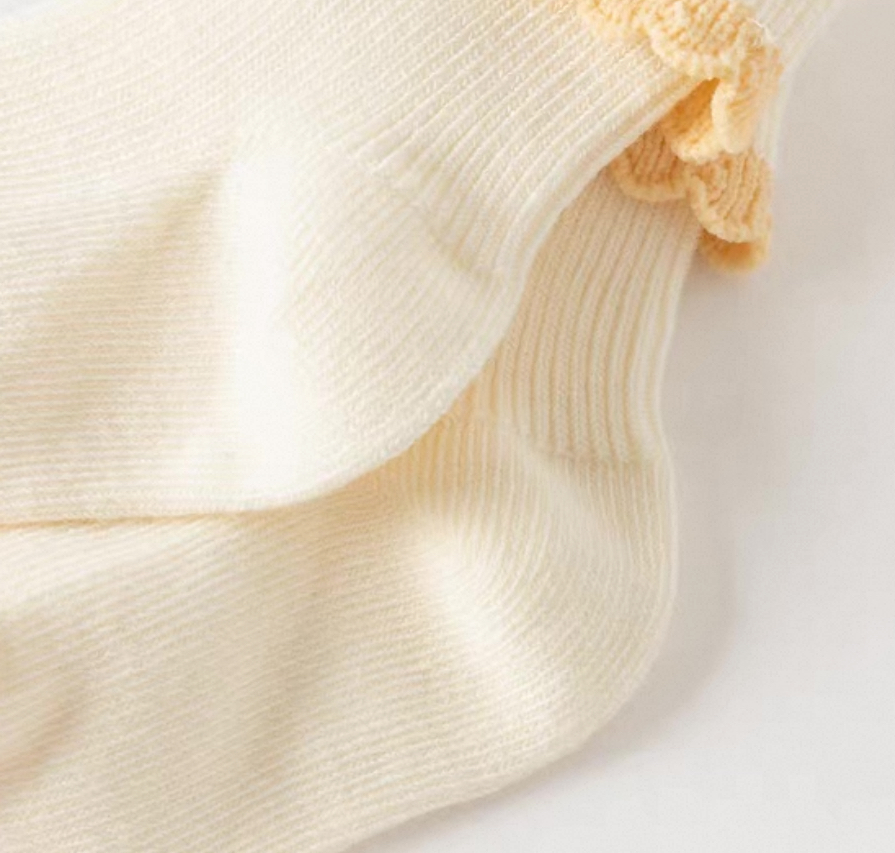 くすみカラーの優しい色合いと、履き口のスカラップデザインがポイントです。