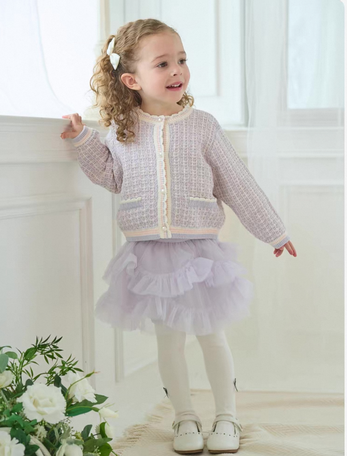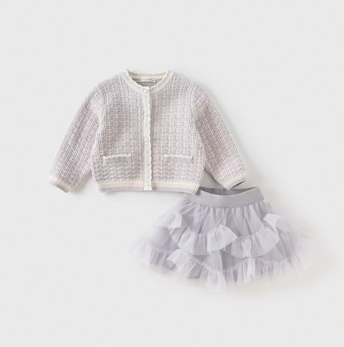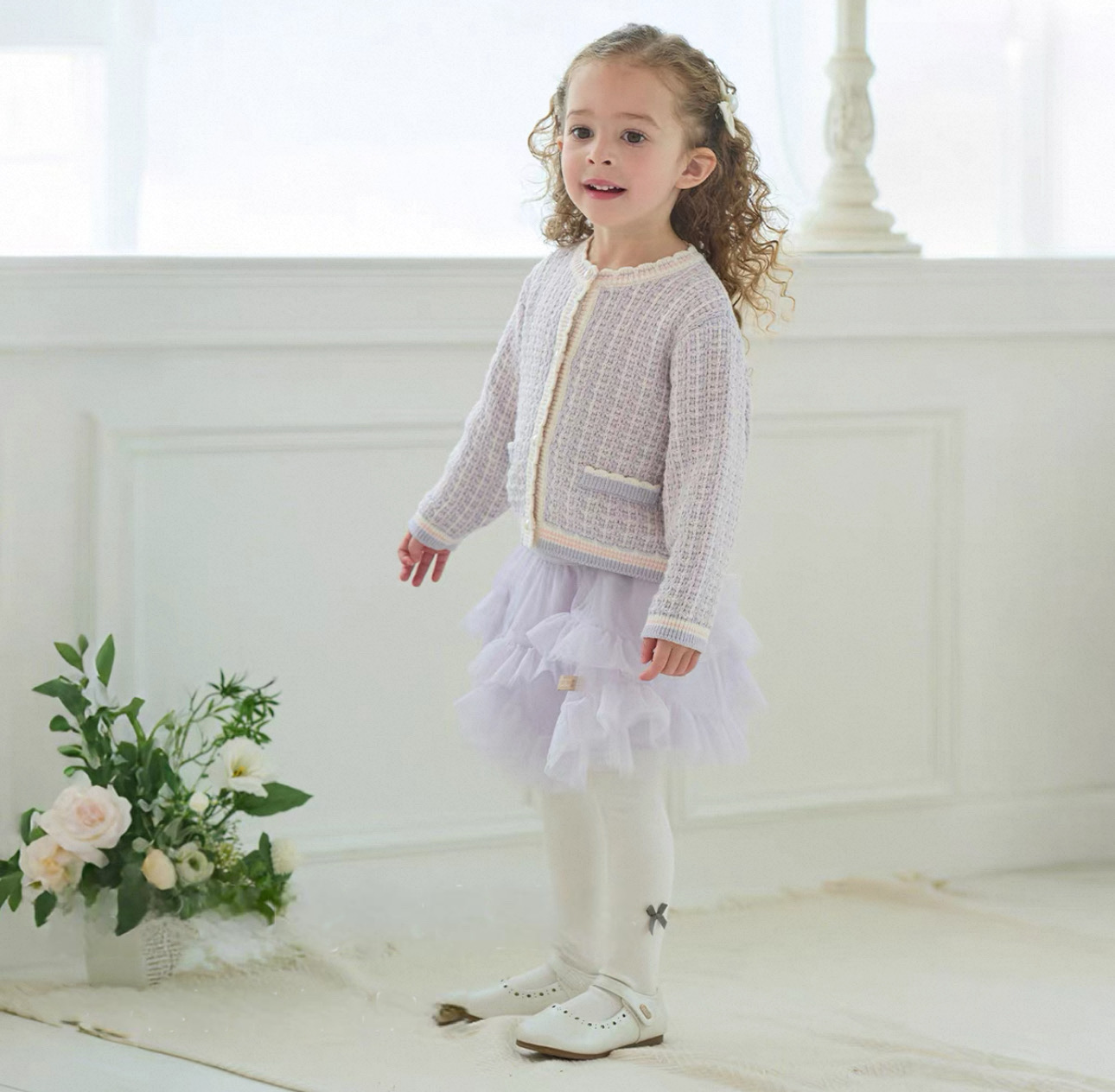 カーディガンはやわらかな編み地に繊細なラメ糸が入り、