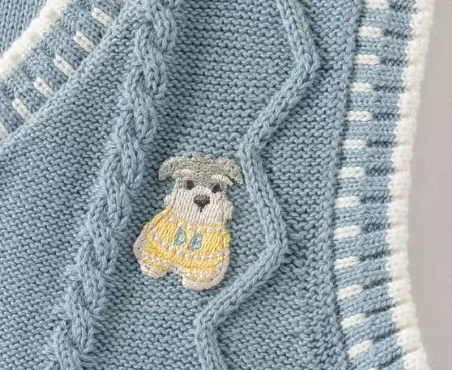 胸元には小さなアニマルモチーフの刺繍ワッペンがポイント。