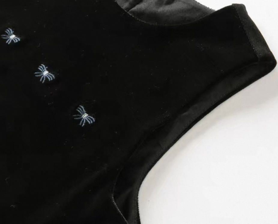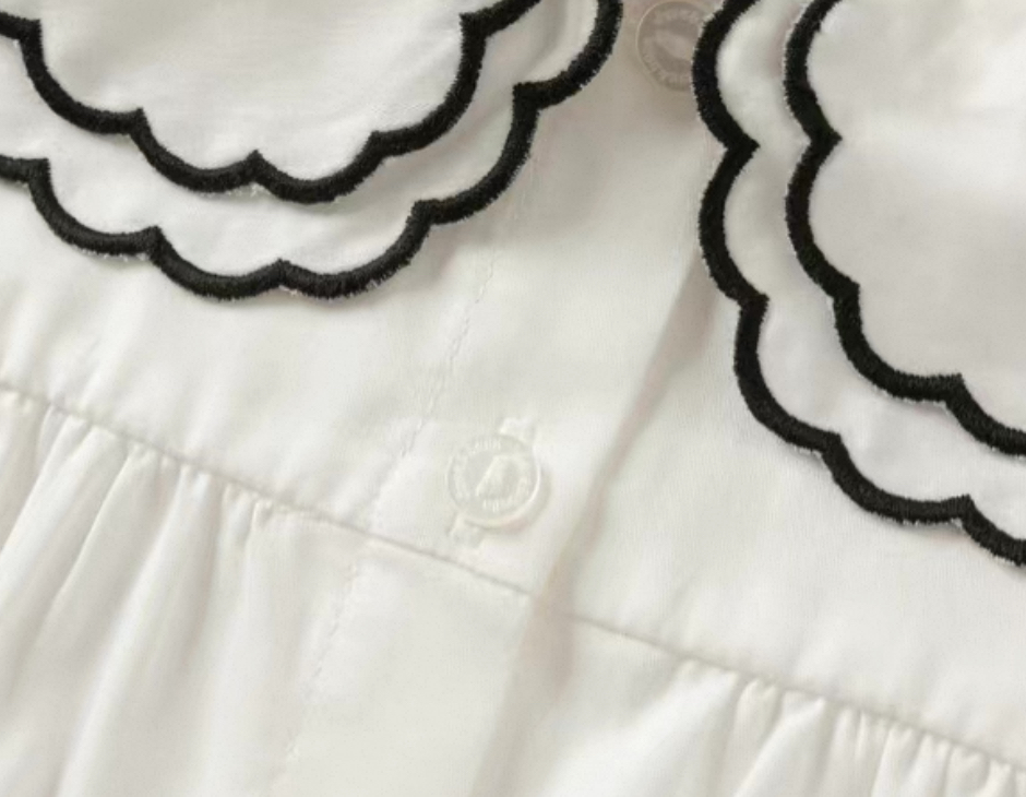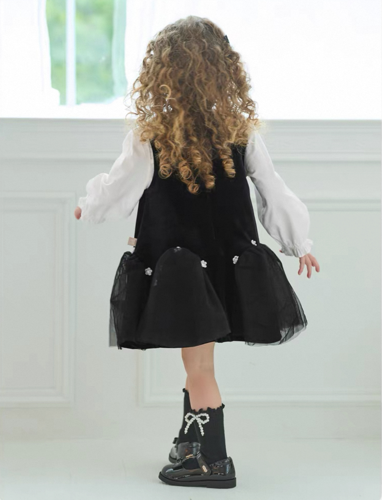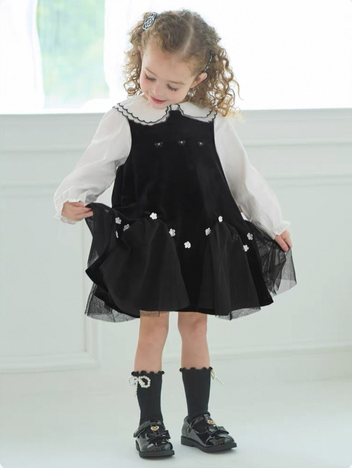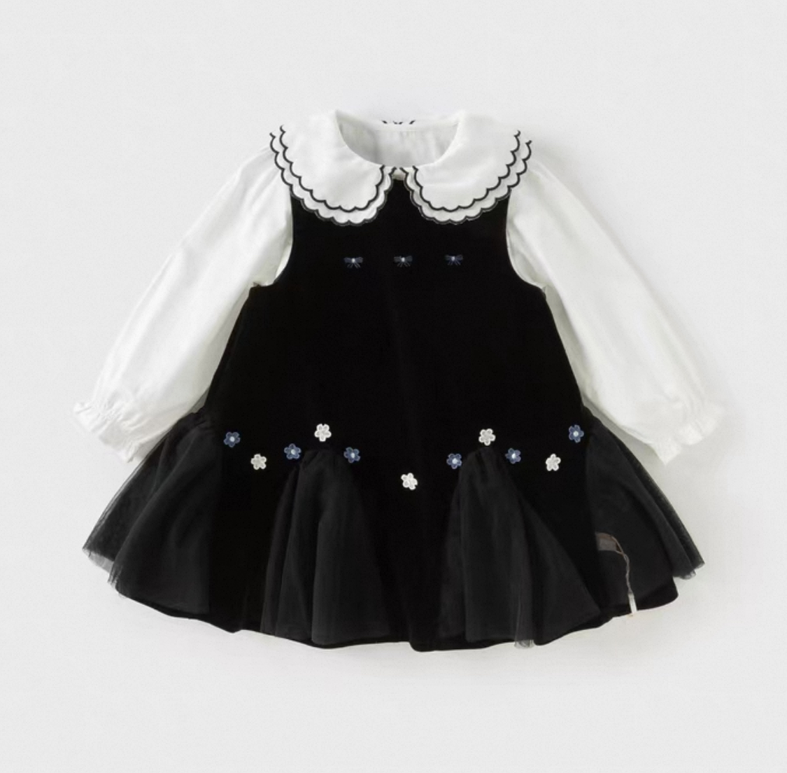上品なベルベット調の黒ワンピースと、丸襟が可愛いホワイトブラウスの2点セットアイテムです。